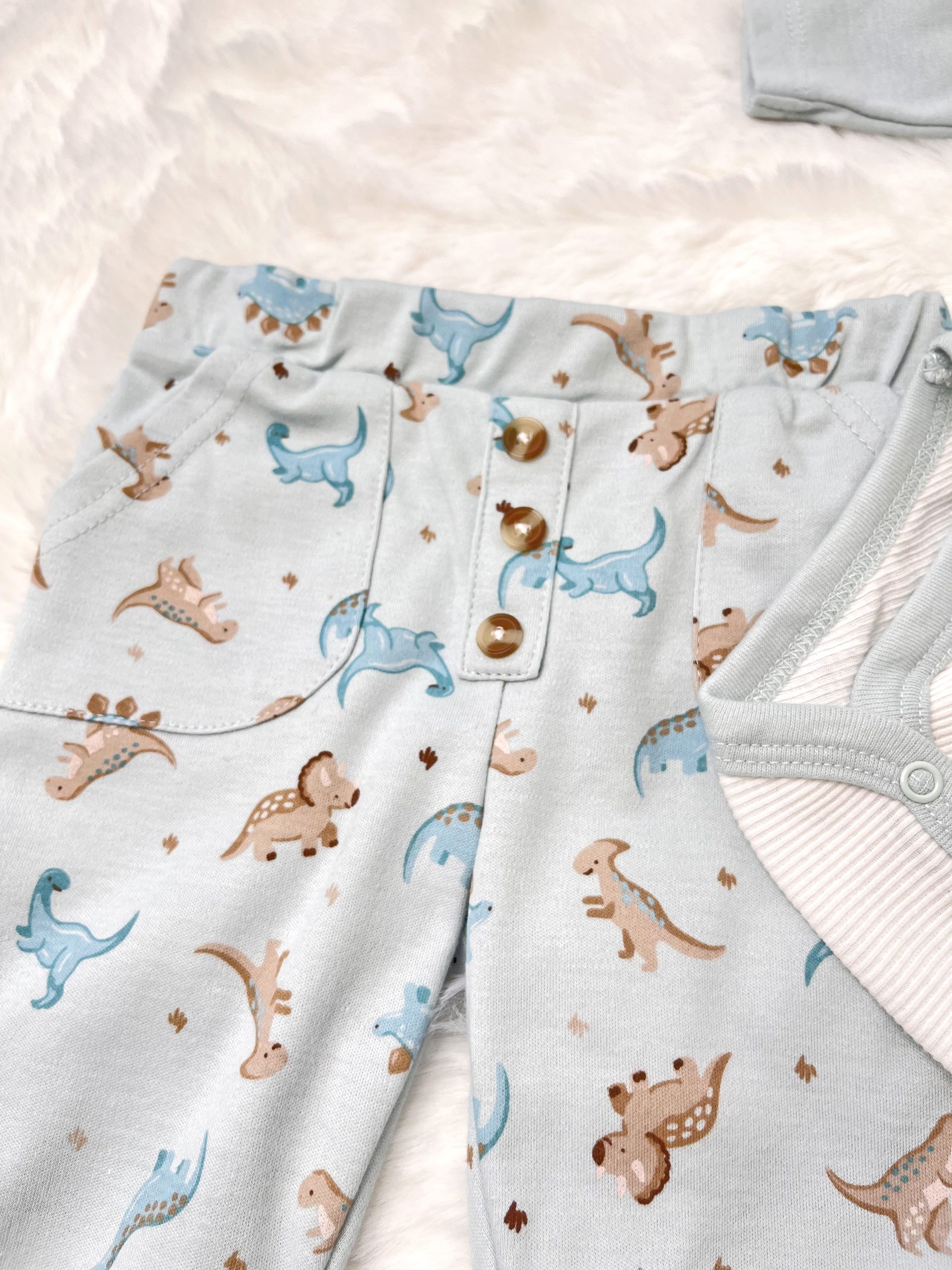 – Colanți într-un ton deschis, cu imprimeu integral cu dinozauri – un design jucăuș și adorabil care oferă personalitate setului. Confortabili și elastici pentru libertate de mișcare.