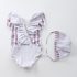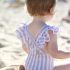 – Costum de baie întreg cu volănașe drăgălașe pe umeri și bretele încrucișate la spate. Confecționat din material cu uscare rapidă și protecție UV, decorat cu imprimeu în dungi pe fundal alb – perfect pentru o stare de spirit estivală.