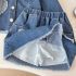 -Fustă mini din denim, cu talie elastică – două buzunare laterale și franjuri la tiv; în față, două aplicații 3D‑inimă adaugă o notă jucăușă.