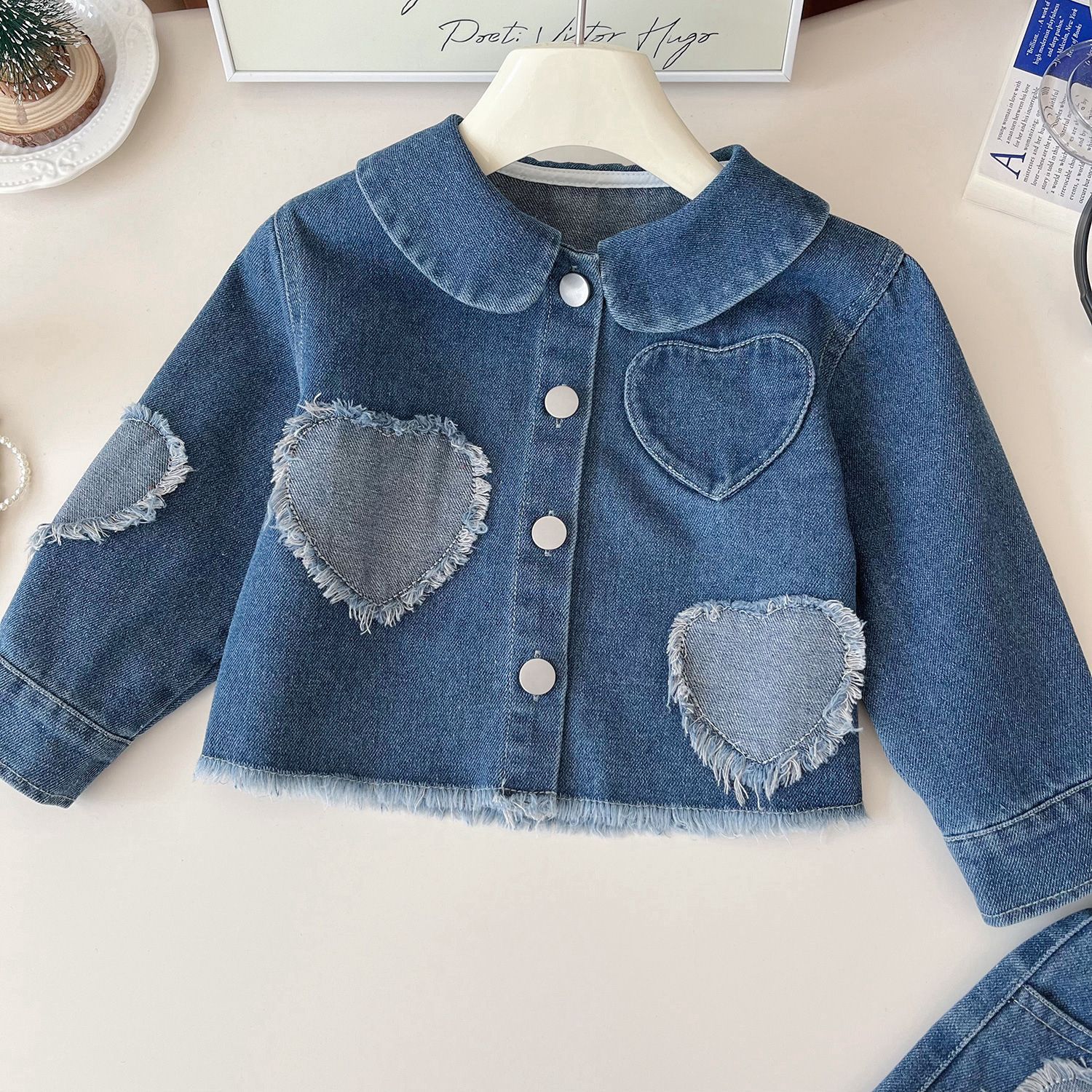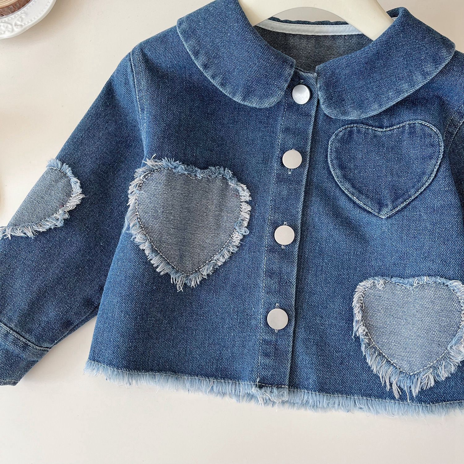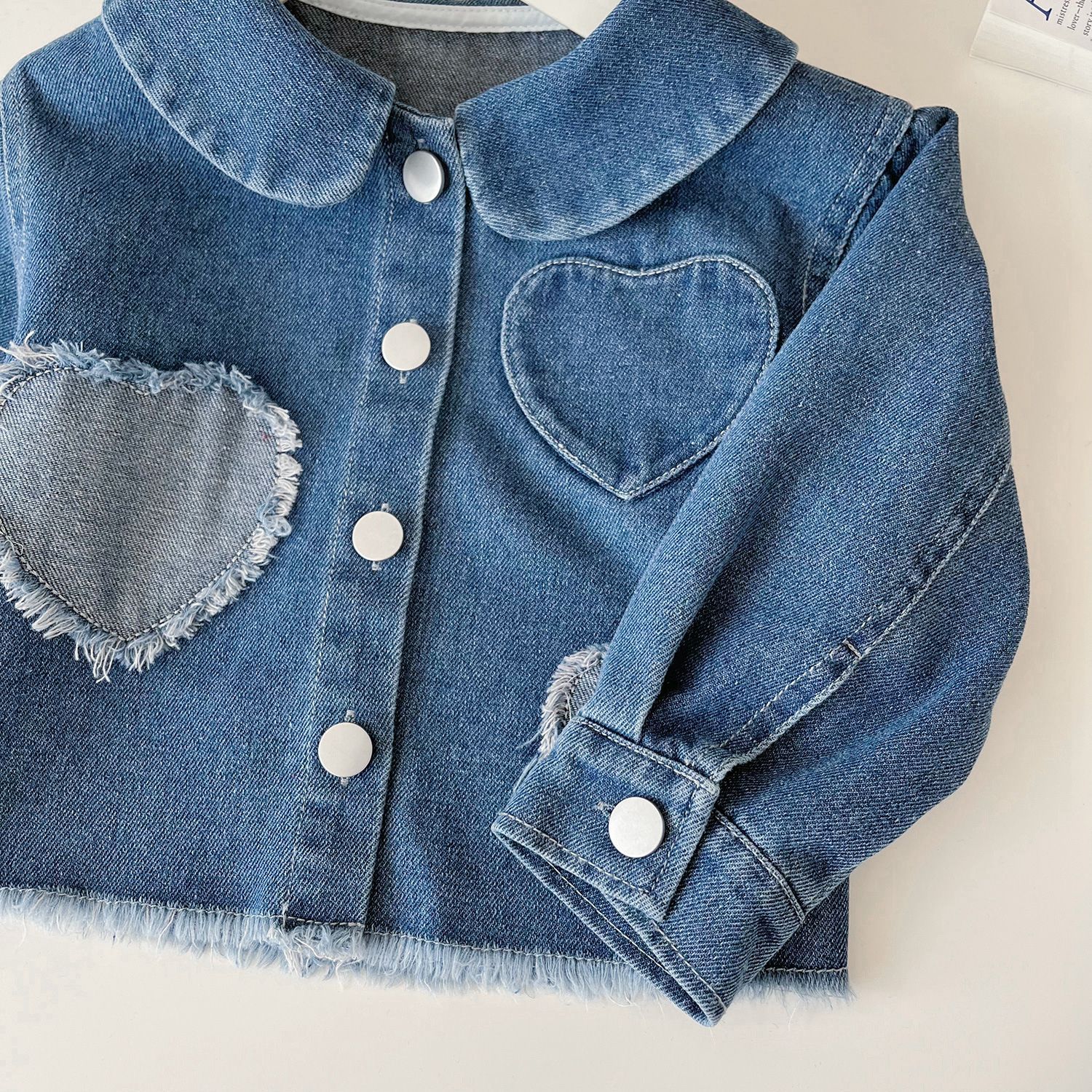 -Geacă din denim moale, de înaltă calitate, în albastru clasic, cu guler. Este decorată cu aplicații 3D în formă de inimă pe față și pe mânecă, iar închiderea se face cu nasturi mari, metalici, pentru un șic boem.