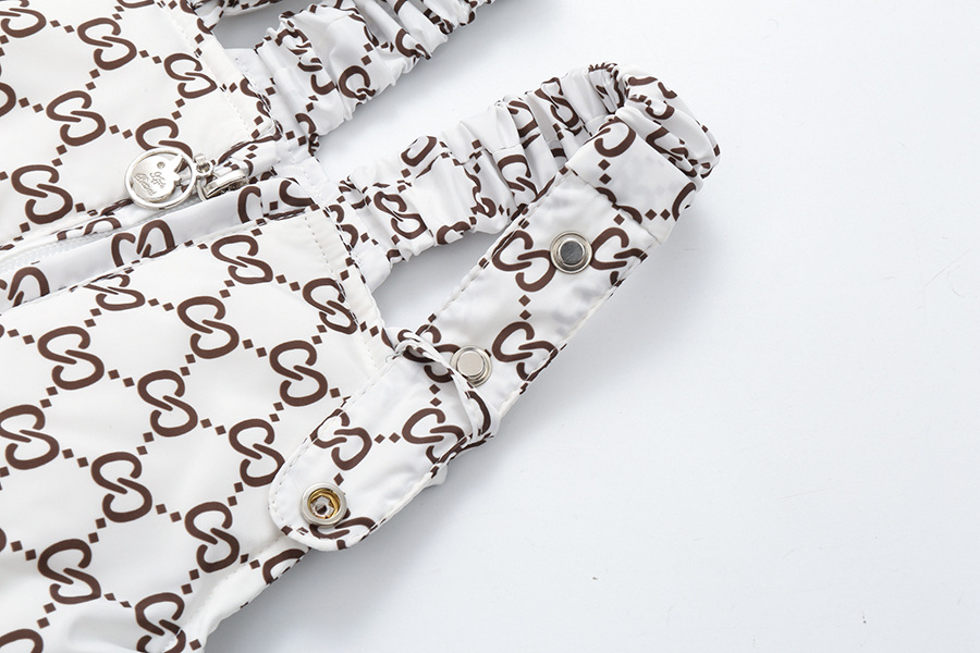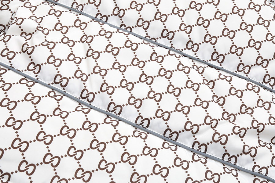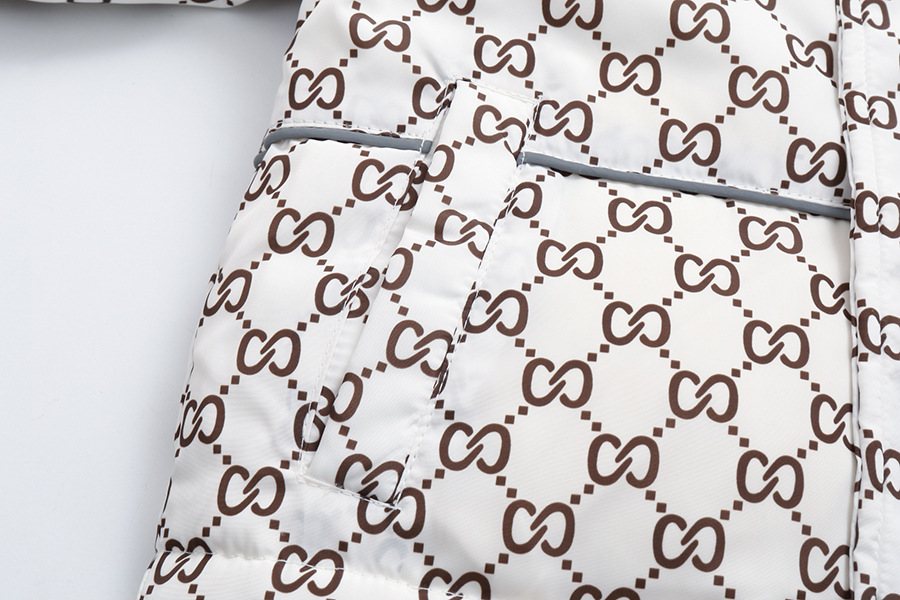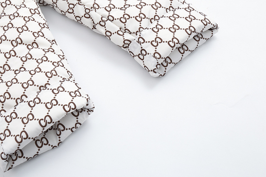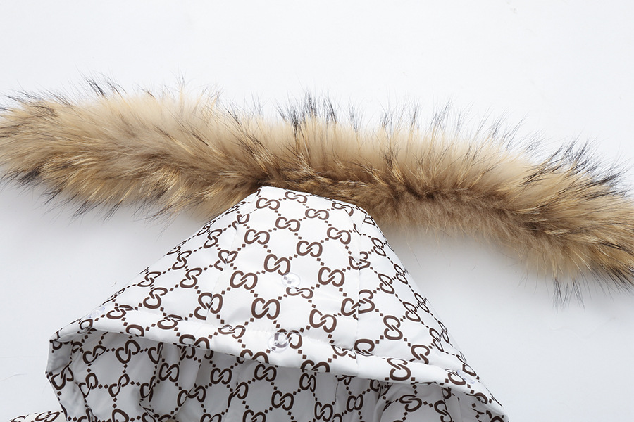 – Geacă confecționată din material impermeabil și rezistent la vânt, de culoare albă ca zăpada, cu un imprimeu monogram atractiv. Modelul este matlasat cu 100% puf de gâscă. Gluga este decorată cu o blăniță detașabilă din blană naturală bogată, care oferă un aspect impresionant. Se închide cu fermoar pe toată lungimea + manșete elastice adăugate pentru protecție împotriva frigului.