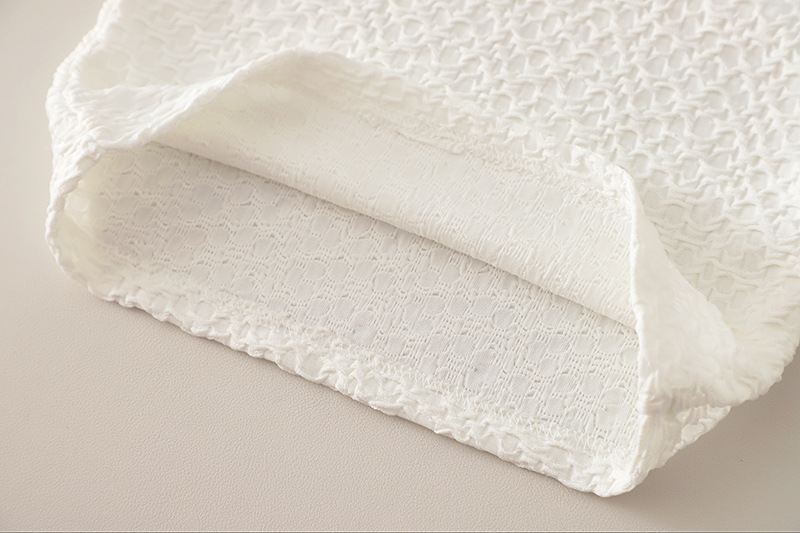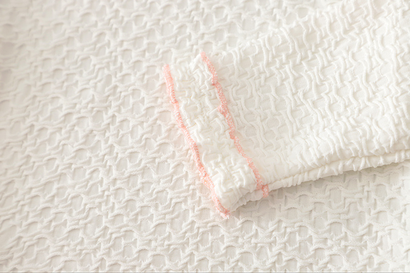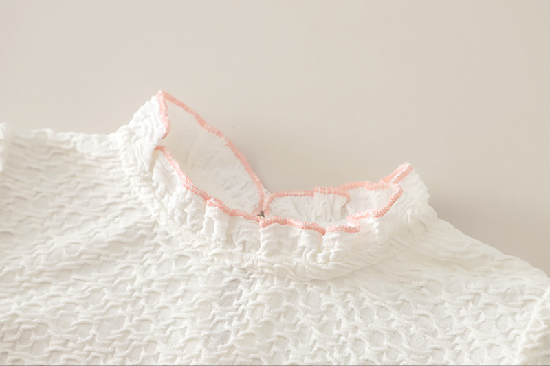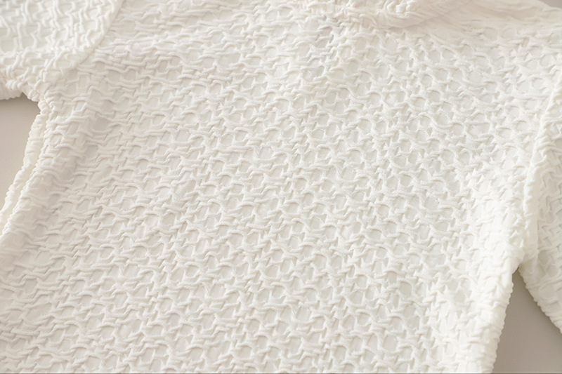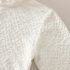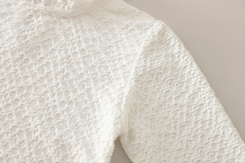 – Bluză cu textură în relief – confecționată dintr-un material rezistent, ușor și fin, cu o textură delicată. Modelul are un guler elegant, înalt, cu volane care adaugă un accent romantic și rafinat. Mânecile sunt prevăzute cu manșete fine și volănașe delicate pentru o siluetă mai elegantă.