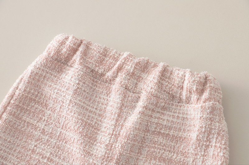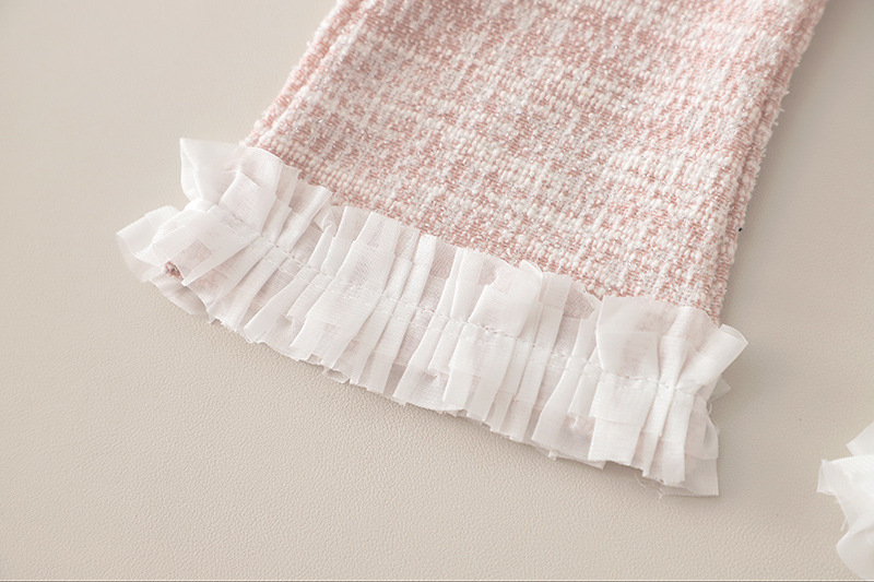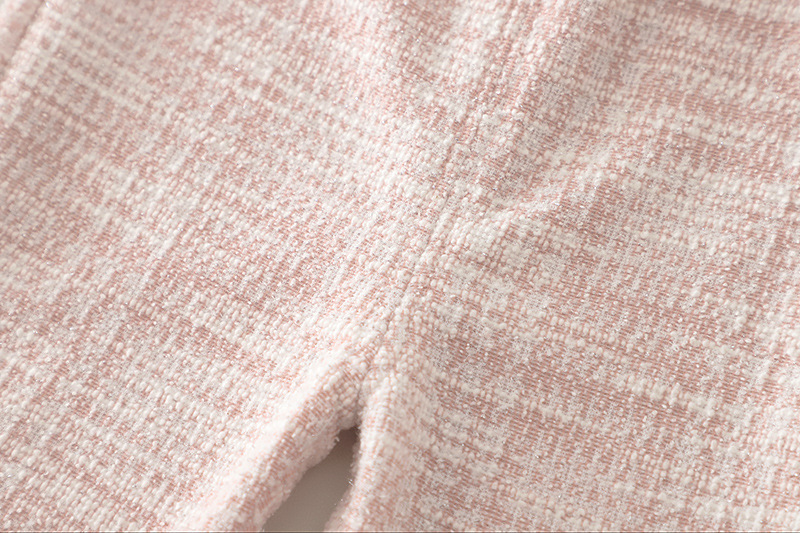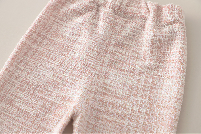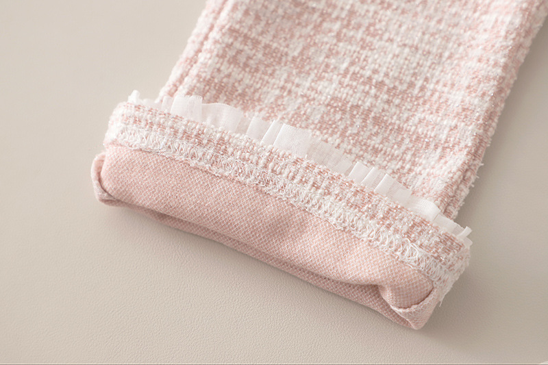 – Pantalon – model confortabil din același material tip boucle, care creează un aspect armonios cu partea superioară. Talie elastică pentru îmbrăcare ușoară, iar partea de jos a cracilor este decorată cu volănașe fine, care oferă o notă romantică finală.