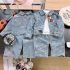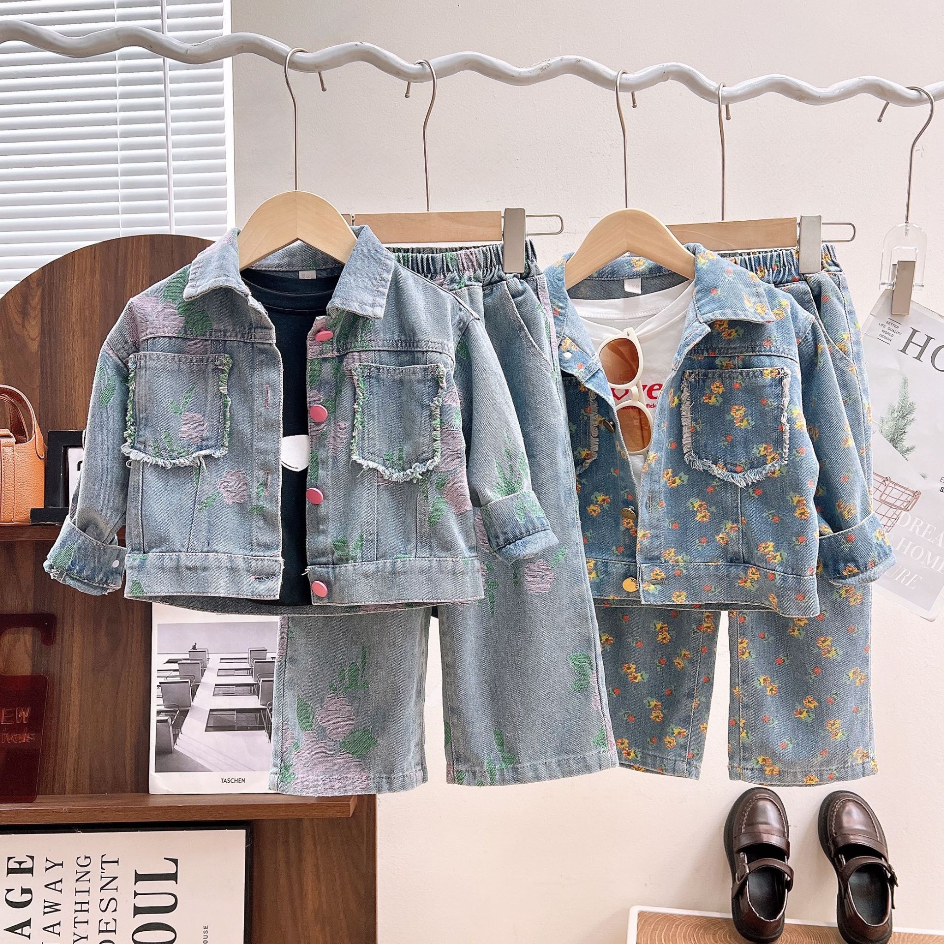 – Pantalon din denim – model confortabil din material denim moale, cu croială lejeră și talie elastică, care asigură îmbrăcarea ușoară și confort pe tot parcursul zilei. Pantalonul este decorat cu același model floral, creând o imagine armonioasă și stilată împreună cu geaca.
