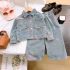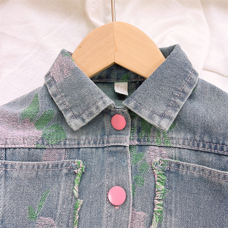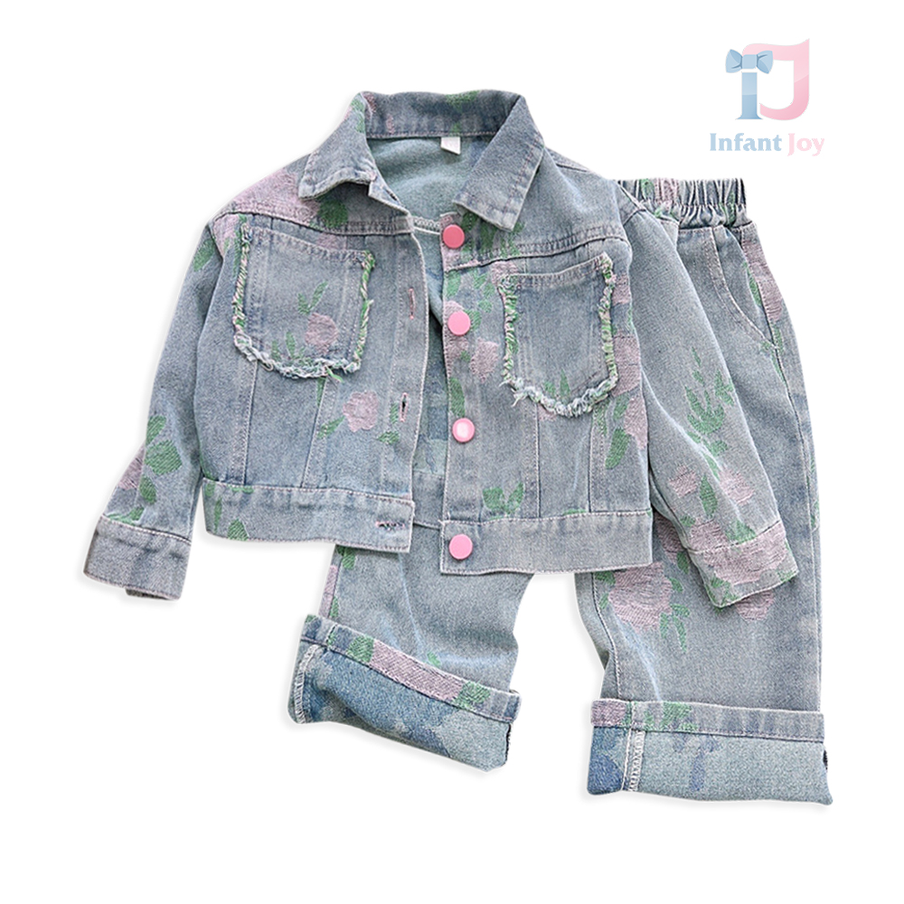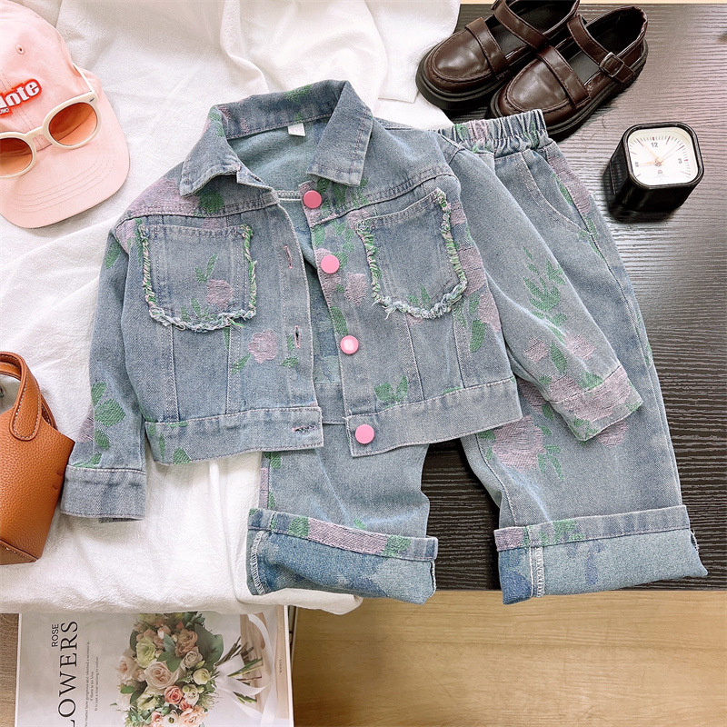 🌸 Set modern din denim, format din 2 piese pentru fetiță, care îmbină designul actual, confortul și detaliile florale delicate.