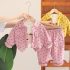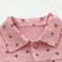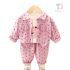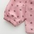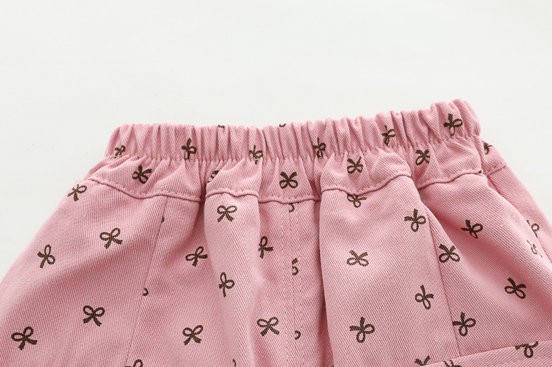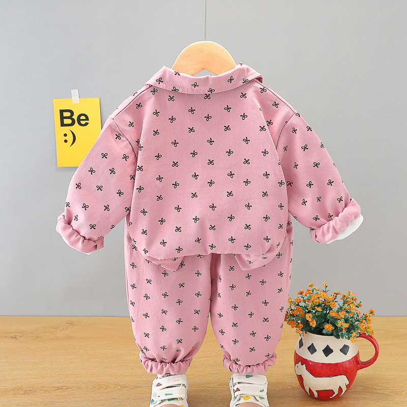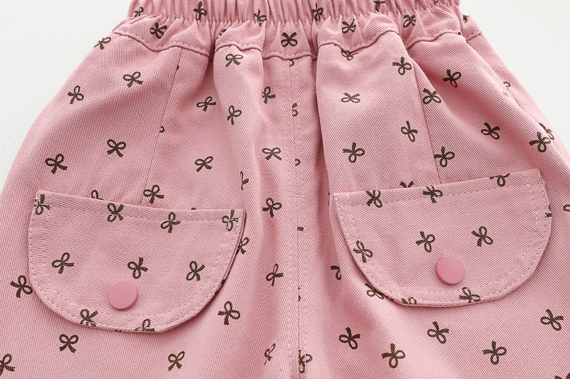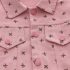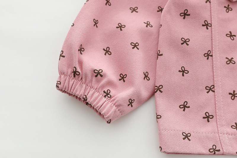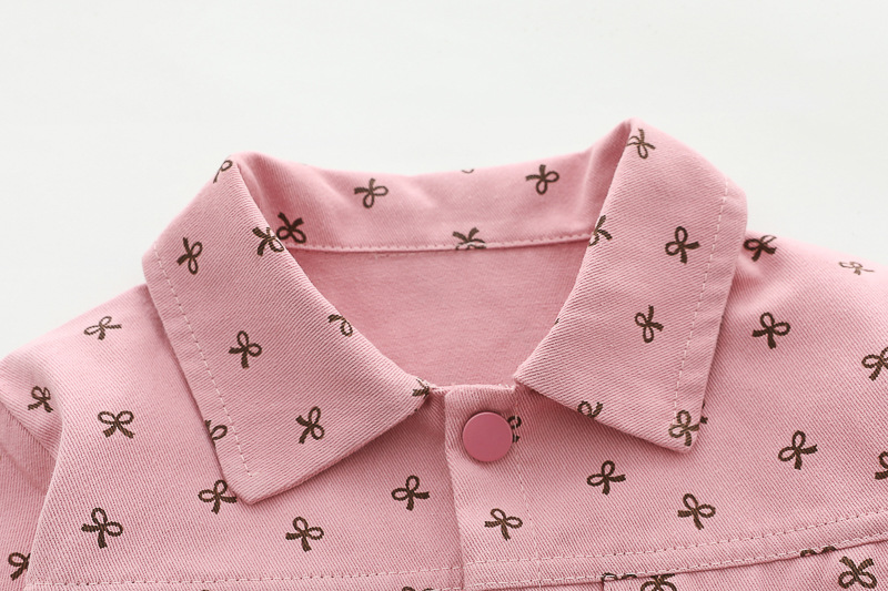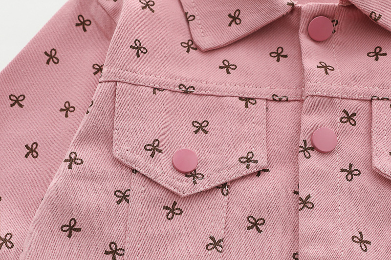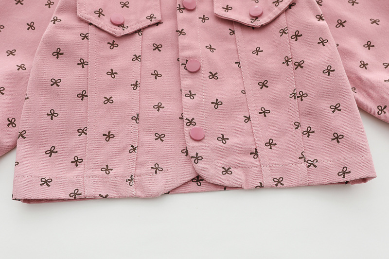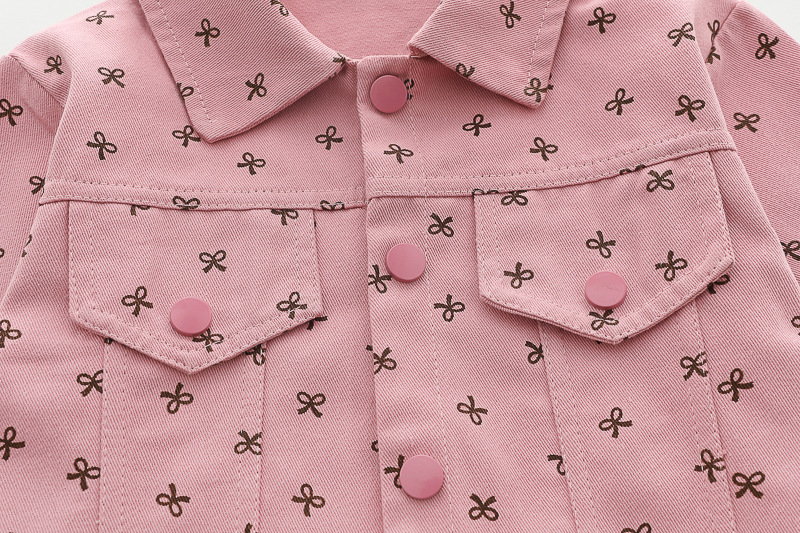 – Geacă din denim subțire, roz, decorată cu imprimeuri fine cu fundițe bleumarin. Modelul are guler clasic, două buzunare decorative cu clapetă și capse pe toată lungimea. Mânecile sunt terminate cu elastic – pentru confort maxim.