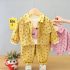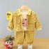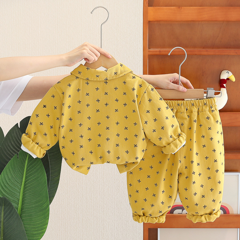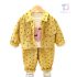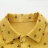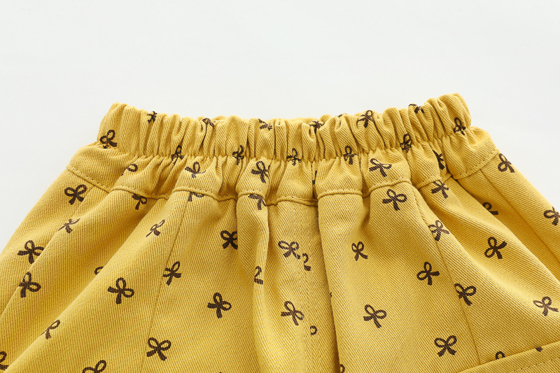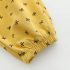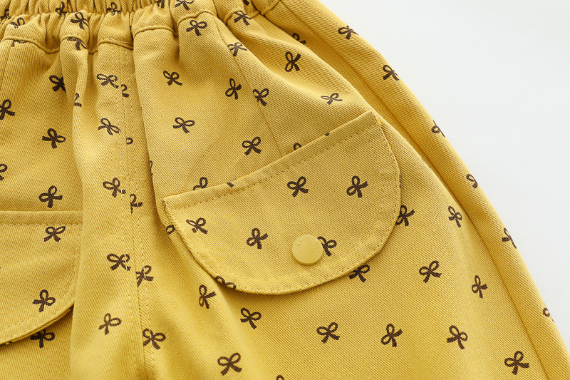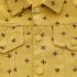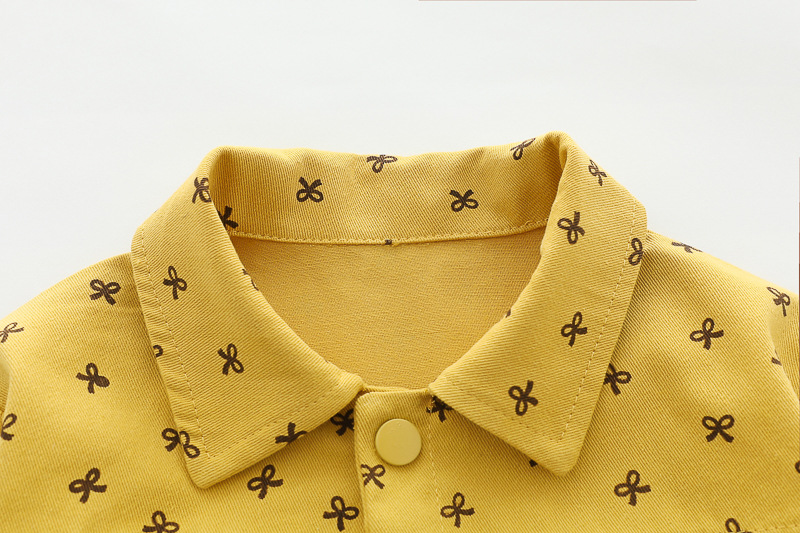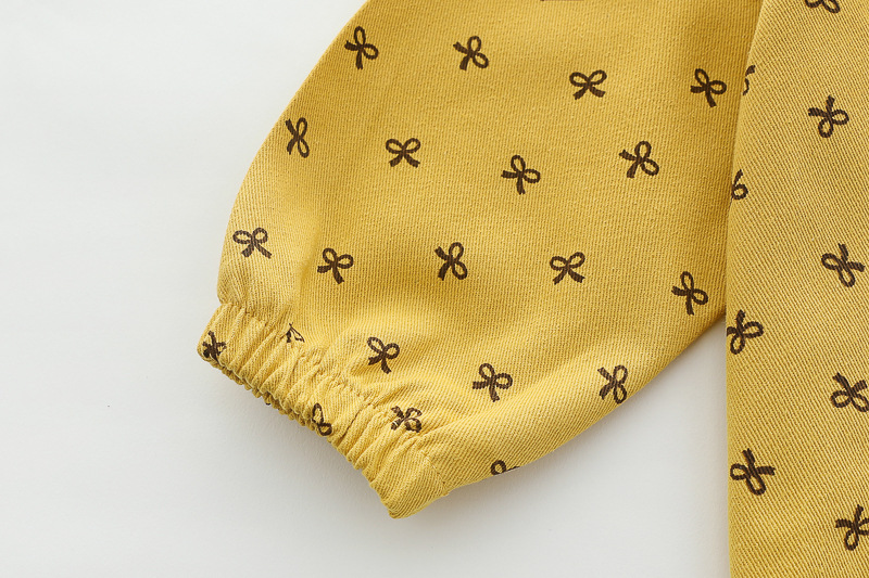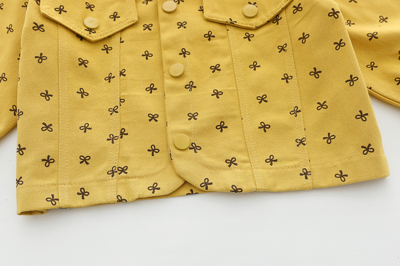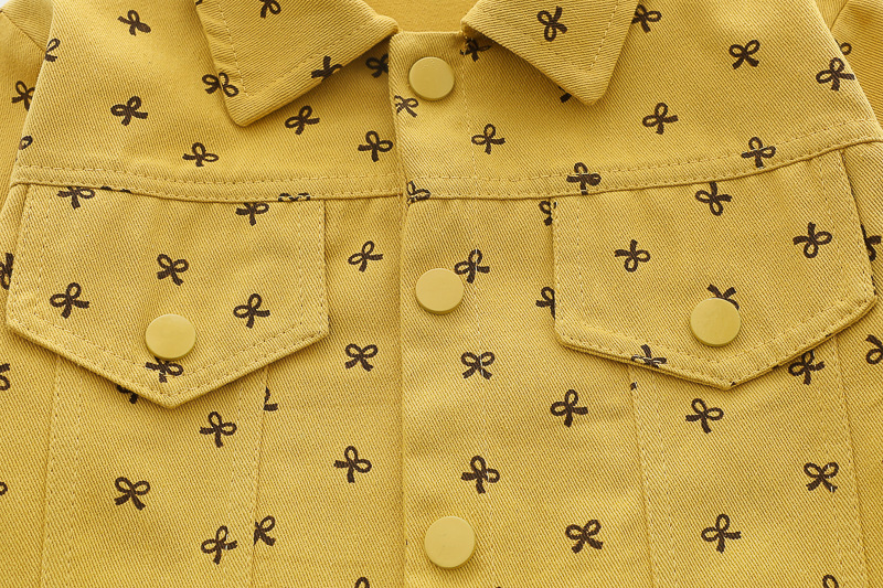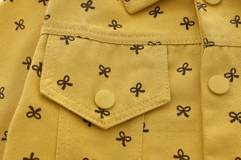 – Jachetă din denim subțire, într-o nuanță intensă de galben muștar, decorată cu imprimeuri fine cu fundițe bleumarin. Model cu guler clasic, două buzunare decorative cu clapete și capse tip tic-tac pe toată lungimea. Mâneci terminate cu elastic – pentru confort maxim.