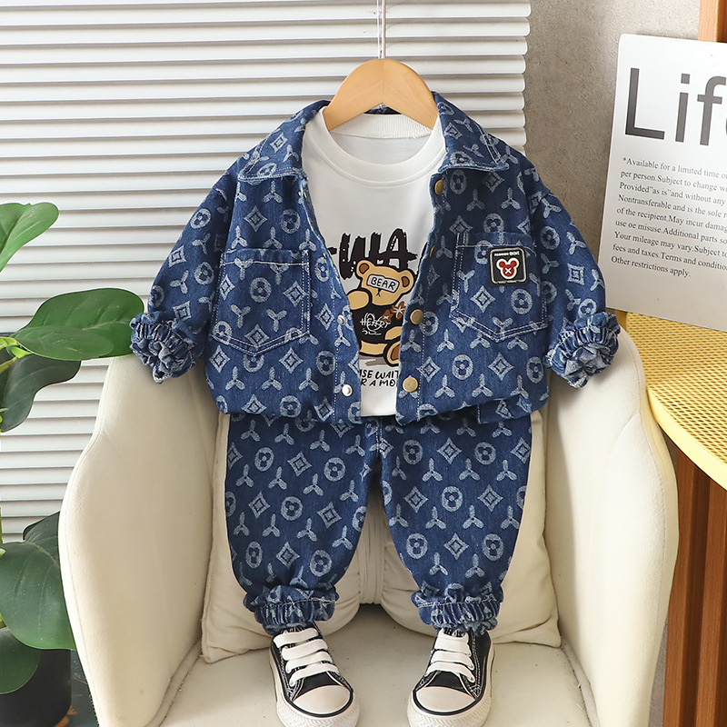 Set din denim de 3 piese cu jachetă cu guler clasic, bluză din bumbac cu imprimeu și pantaloni Denim Disrupt