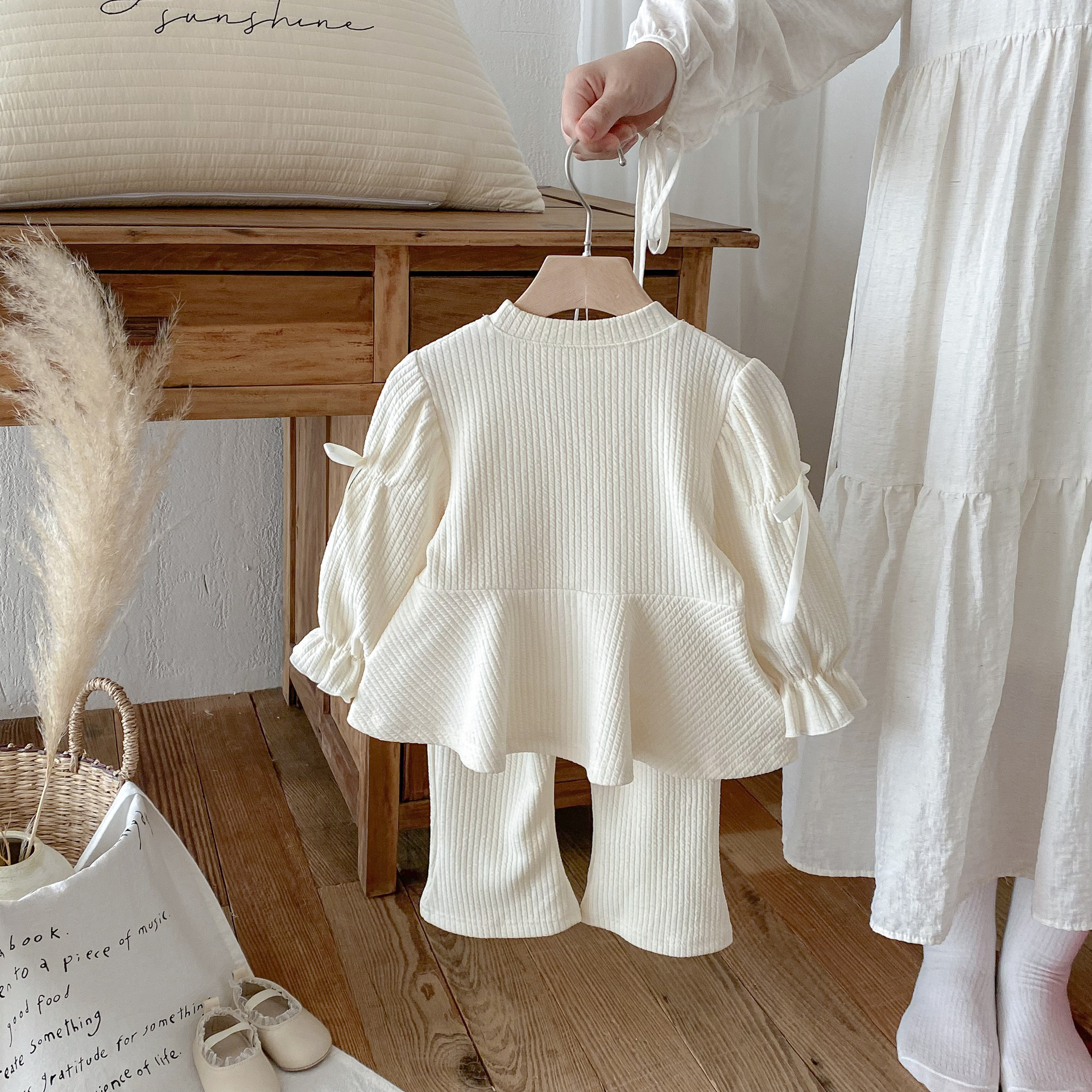 Set din tricot reiat de 2 piese cu tunică cu mâneci bufante și pantaloni tip „clopot” Ivory Bliss
