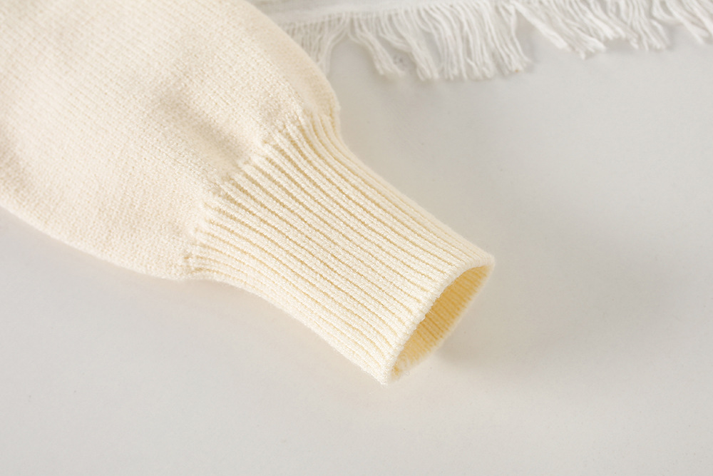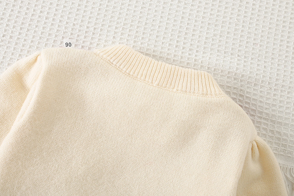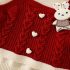 – Pulover – model moale și călduros, din tricotaj fin, într-o nuanță elegantă de crem. Cu guler înalt elastic și mâneci lungi, oferă confort și protecție în zilele reci. Modelul are un top tricotat cu bretele aplicat – într-o frumoasă nuanță intensă de roșu, realizat din tricotaj texturat cu nasturi decorativi în formă de inimioare în partea din față.