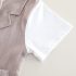 – Cămașă albă cu guler clasic și mânecă scurtă, cu vestă aplicată în nuanță bej, cu model fin în dungi verticale ce imită perfect stilul unui costum. Prevăzută cu două buzunare decorative și nasturi în față pentru un aspect rafinat. Accesoriu distinctiv – emblemă mică cu ursuleț pe o parte.