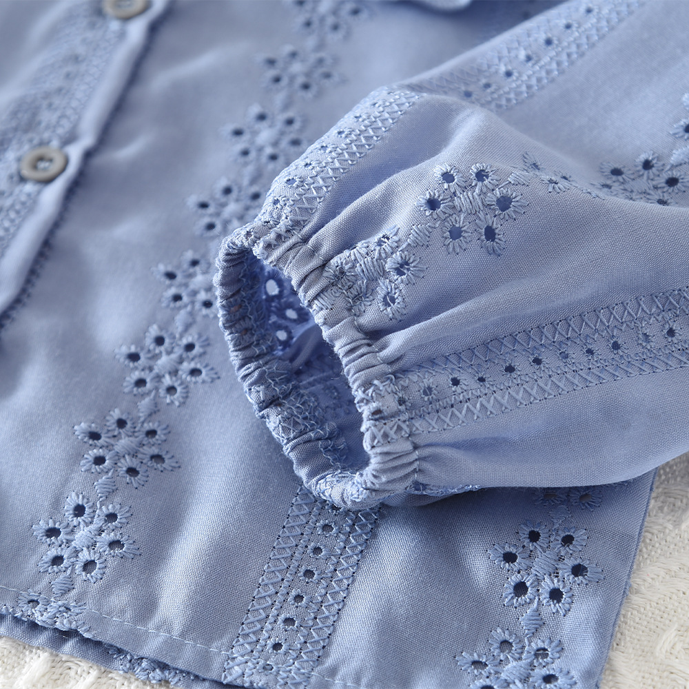– Cămașă cu guler tip Peter Pan – model elegant cu guler decorativ, amplu, cu volane, care adaugă o notă clasică și romantică. Realizată din material ușor și respirabil, cu broderie fină și detalii ajurate, cămașa este foarte delicată cu pielea. Închiderea cu nasturi în față completează designul rafinat. Mâneci ușor bufante, cu elastic pentru confort.