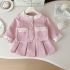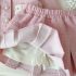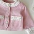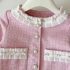 – Sacou realizat din material boucle moale, într-o nuanță roz pudrat, decorat cu nasturi perlați și volănașe albe fine la guler și manșети. Buzunarele din față sunt accesorizate cu fundițe și perle mici, oferind o notă romantică și rafinată.
