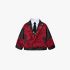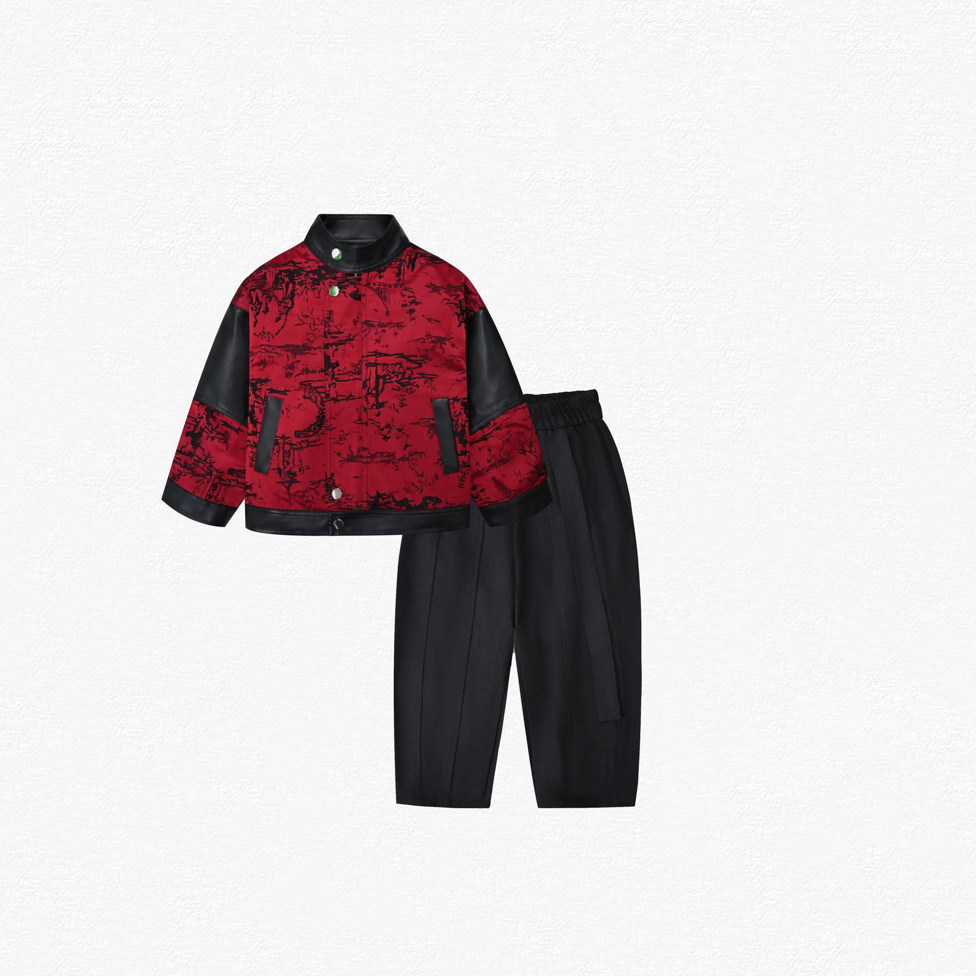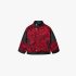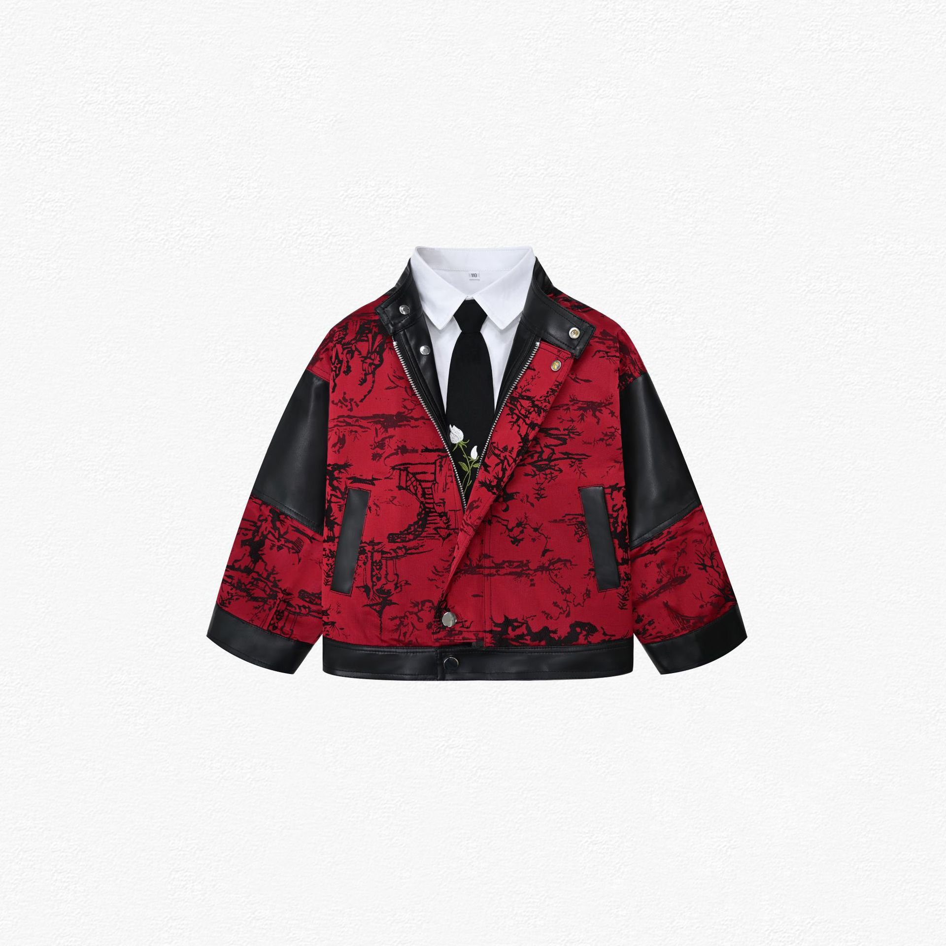 – Jachetă extravagantă cu guler clasic – model în roșu intens, cu un imprimeu artistic și elemente contrastante negre din imitație de piele pe mâneci și detalii. Se închide cu nasturi și fermoar, are o croială modernă și buzunare stilate care conferă un aspect finisat și luxos.