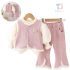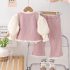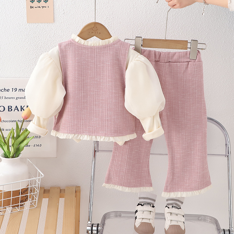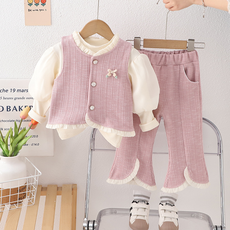 Set elegant de 3 piese cu vestă cu nasturi perlați, bluză rib cu mâneci bufante și pantaloni Donna Bella