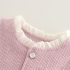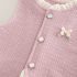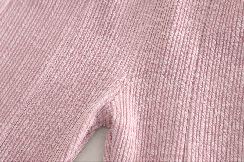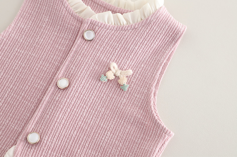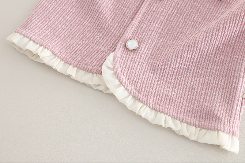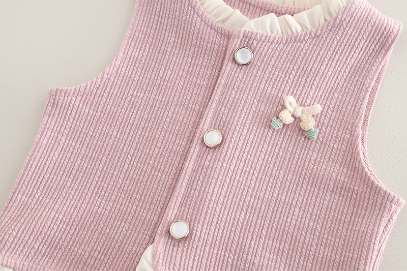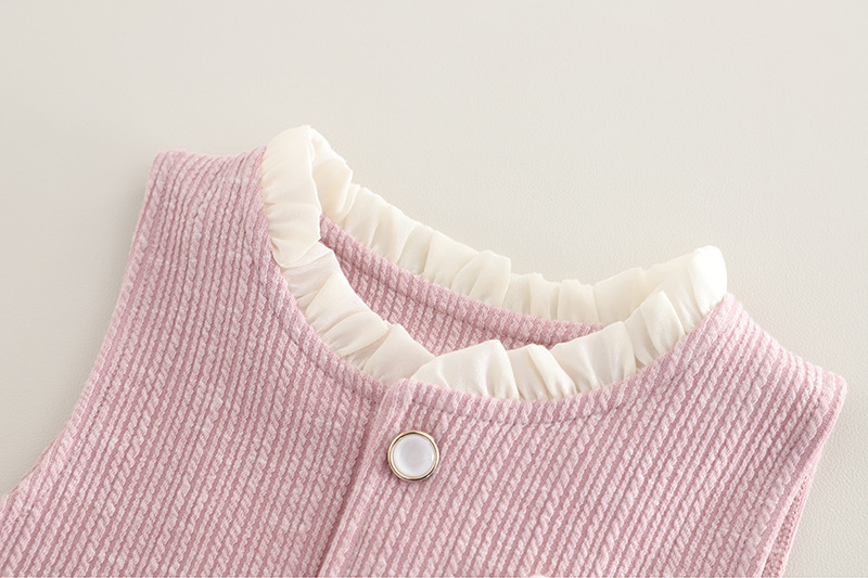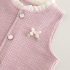 – Vestă din material fin, cu textură reliefată, în culoare roz prăfuit, decorată cu nasturi tip perlă și o fundiță delicată cu accente decorative. Croială simplă, dar elegantă, potrivită atât pentru ținute de zi cu zi, cât și pentru ocazii mai speciale. Prezintă volane efectuoase la decolteu și la baza vesei, care pun în valoare designul.