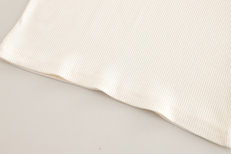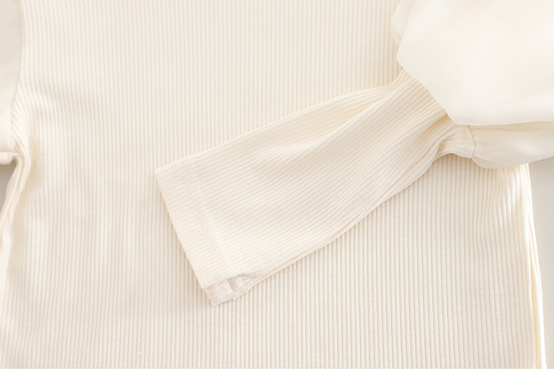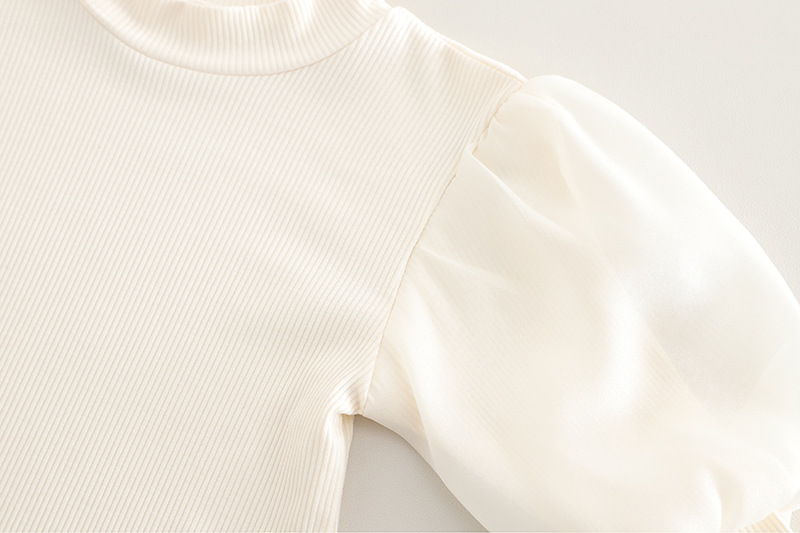 – Bluziță tip polo în culoare ecru, cu textură rib și elasticitate, mâneci bufante și guler înalt, ornamentat cu organza la mâneci pentru un plus de rafinament. Materialul este moale și plăcut la atingere, oferind confort pe tot parcursul zilei.