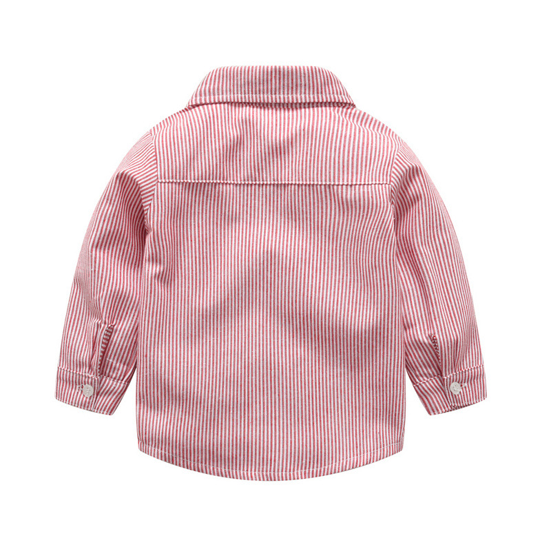 – Cămașă cu dungi din bumbac, cu guler clasic – un model elegant în dungi roșii și albe, cu închidere fină cu nasturi. Accentul este pus pe papionul aplicat și buzunarul decorativ cu batistă, care oferă o notă oficială și un aspect desăvârșit.