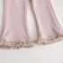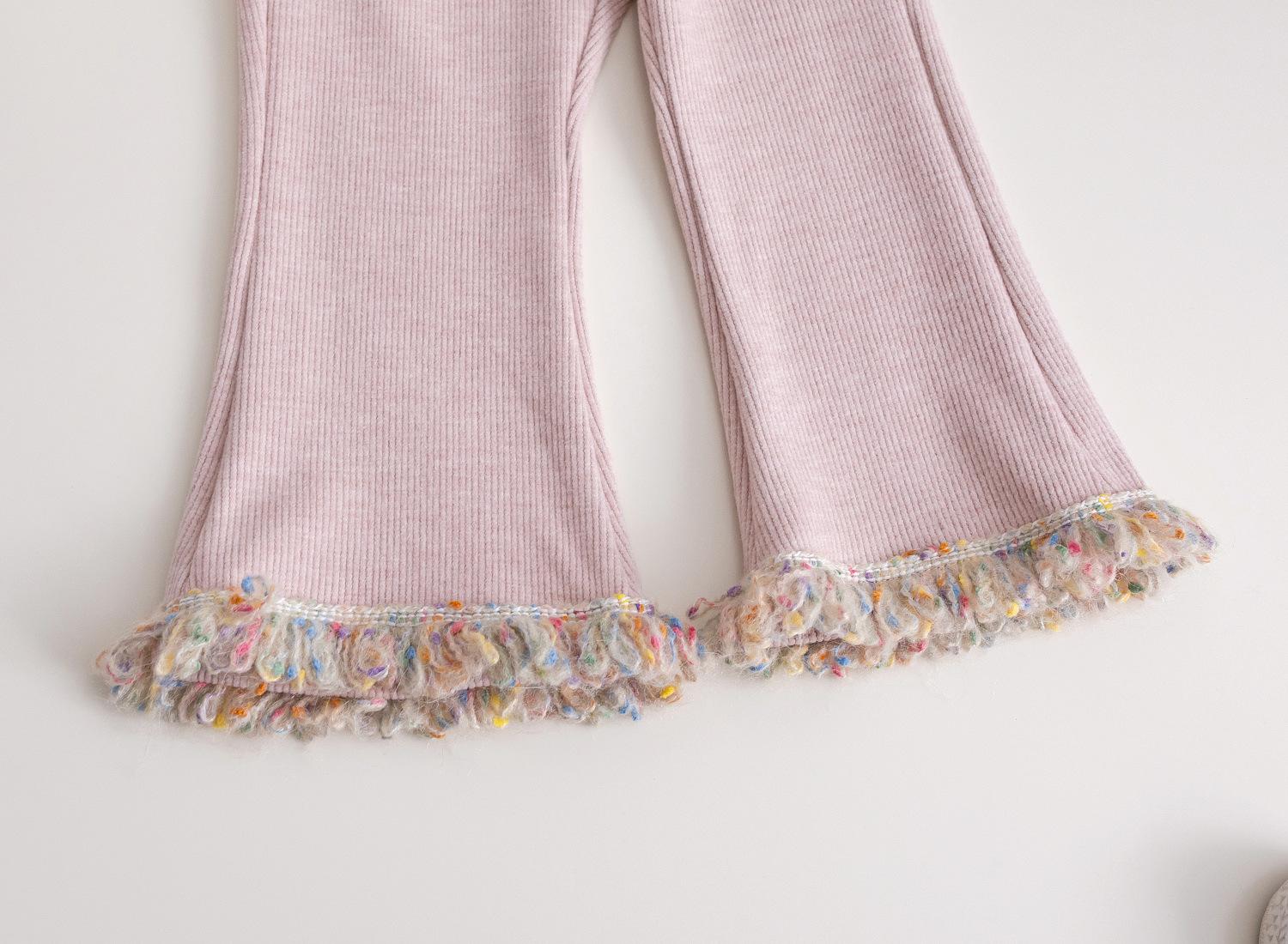 – Pantalon din același material, cu efect cloș și franjuri-decor în partea de jos pentru un plus de veselie, talie elastică și două buzunare.
