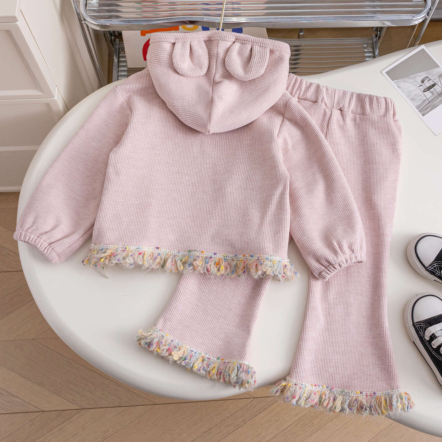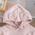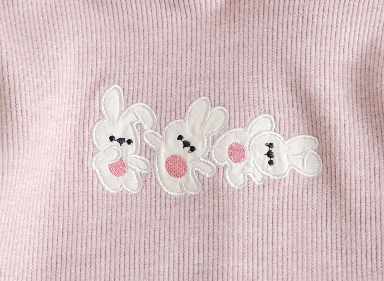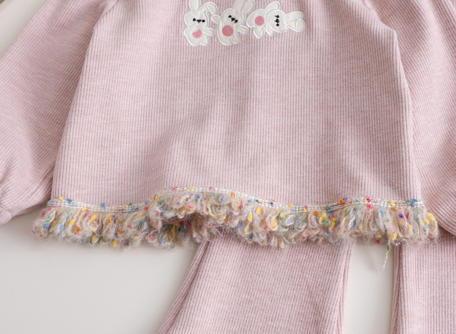 – Bluziță/Hanorac cu glugă din material reiat moale, în culoarea roz pudră. Model cu glugă și urechiușe 3D, imprimeu drăguț cu iepurași în partea din față și franjuri colorate aplicați în partea de jos ca accent al modelului + manșete elastice la mâini pentru confort și lejeritate la purtare.