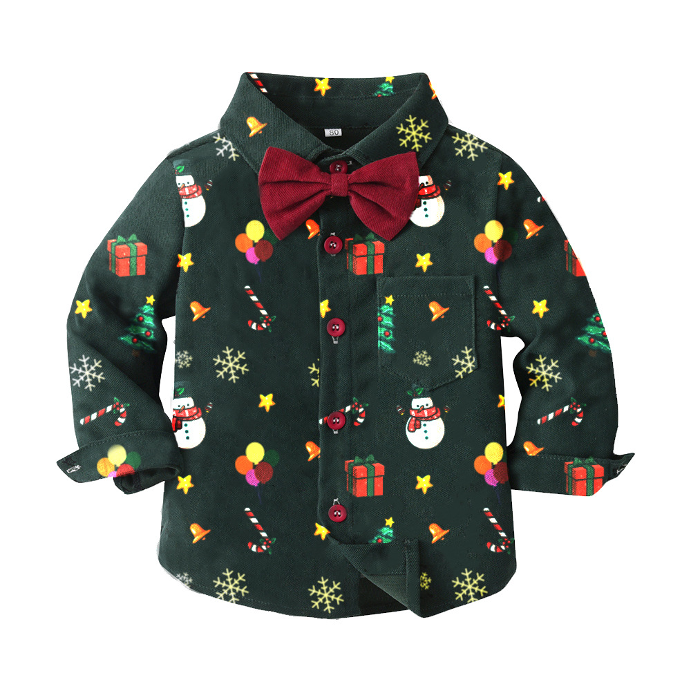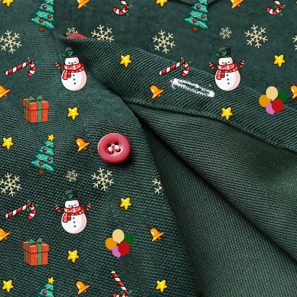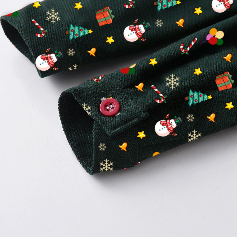 – Cămașă de Crăciun în culoare verde închis, confecționată din bumbac de înaltă calitate. Suprafața este decorată cu motive de sărbătoare: oameni de zăpadă, brazi, cadouri, fulgi de nea și alte elemente de Crăciun. Croiala este confortabilă, cu guler clasic și nasturi pe toată lungimea.
