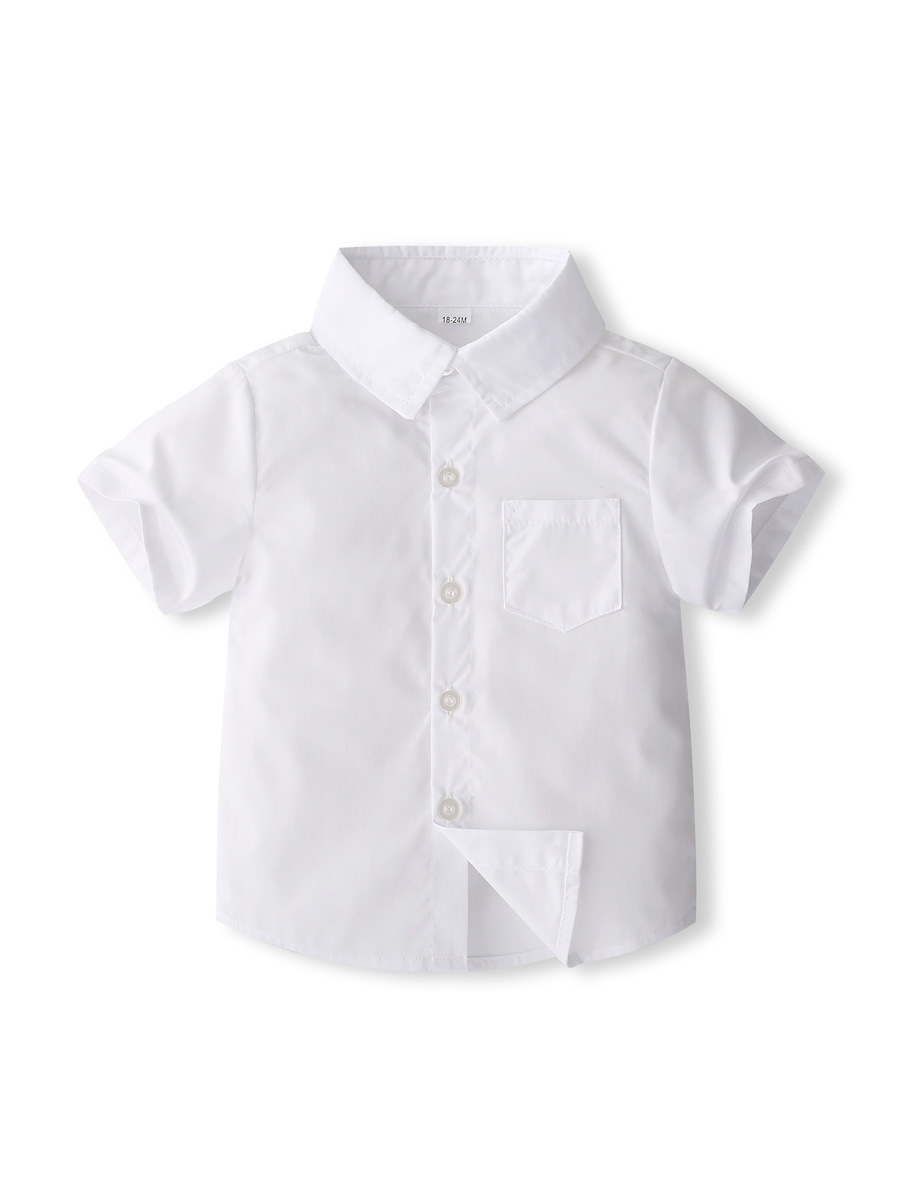 -Cămașă albă, din material ușor și bumbac. Model clasic cu mânecă scurtă, guler, închidere frontală și buzunar pe partea stângă.