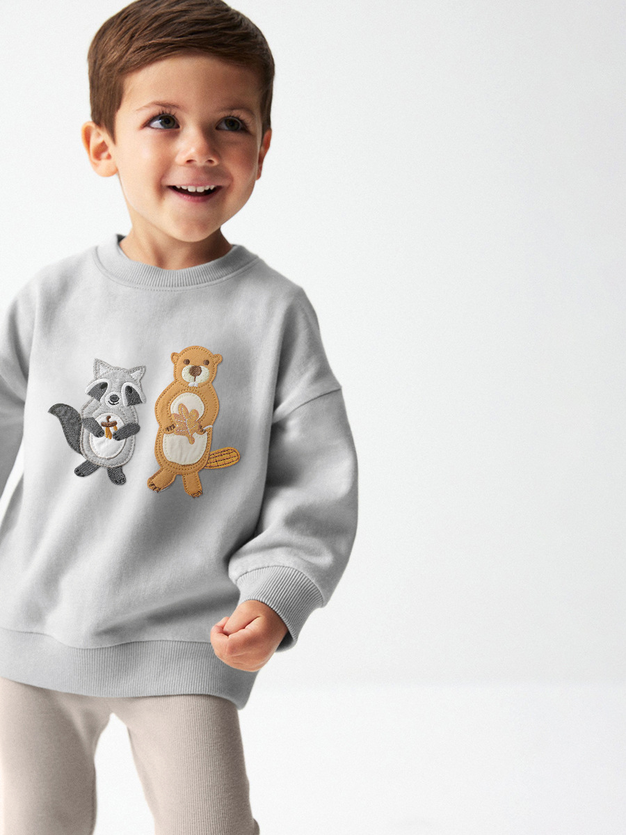 -Bluză/sweatshirt realizată din material moale, din bumbac matlasat, de culoare gri elegantă. Modelul are croială standard și include aplicații adorabile cusute cu animale în partea din față.
