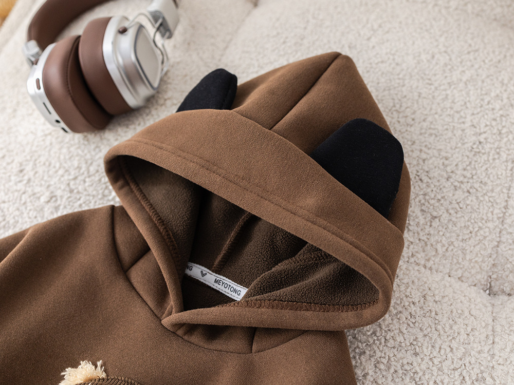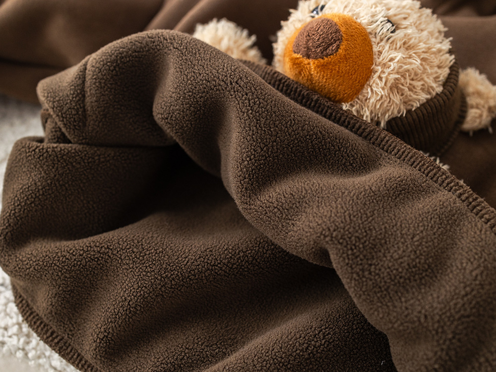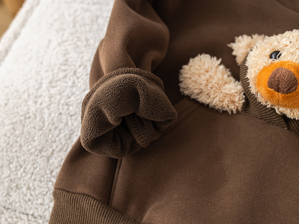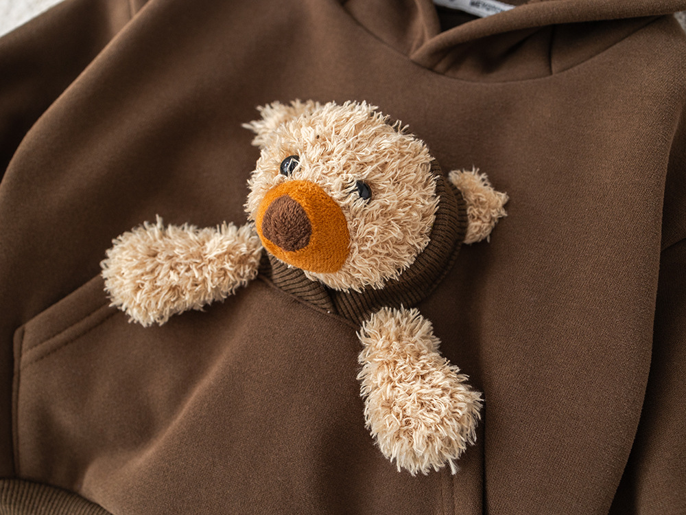 -Hanorac cu glugă, confecționat din material din bumbac, cu adaos de vatelină călduroasă, într-o nuanță de ciocolatiu. Se distinge prin buzunarul tip „cangur”, din care „răsare” un ursuleț 3D detașabil, ca element decorativ. Croiala este lejeră și confortabilă, iar mânecile și tivul sunt finisate cu manșete din tricot elastic pentru un plus de confort.