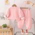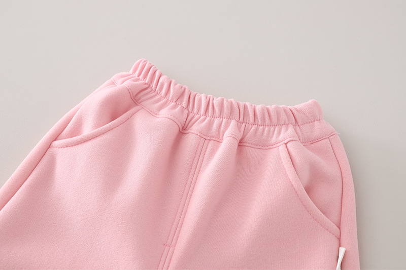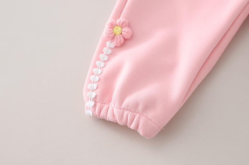 -Pantalon asortat cu bluza, cu talie elastică și buzunare laterale practice. Partea de jos a cracilor este decorată cu floricele 3D miniaturale și perle decorative, oferind un accent jucăuș și diafan.