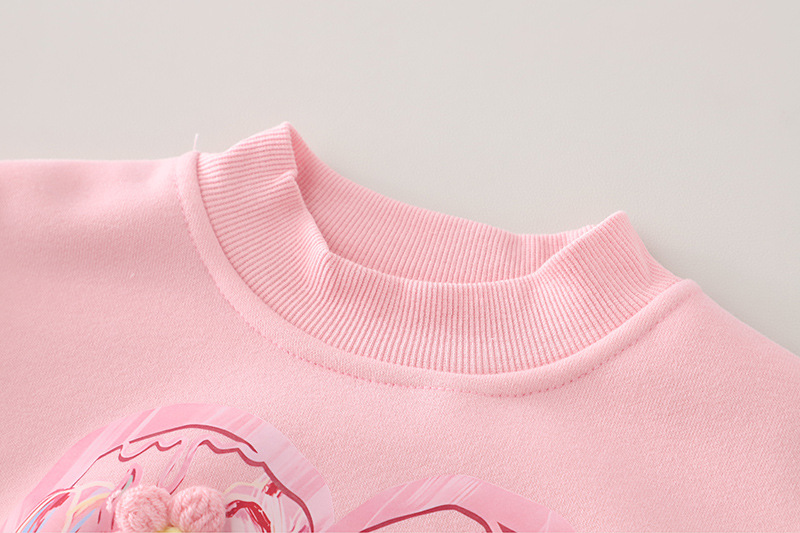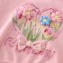 -Bluză/hanorac din bumbac cu vată adăugată, în nuanță roz, cu un imprimeu mare în formă de inimă, decorat cu flori în tonuri pastelate. Accentul este o fundiță tridimensională și mici floricele 3D, care adaugă un farmec deosebit de delicat. Este finisată cu manșete din tricot elastic și decolteu rotund.