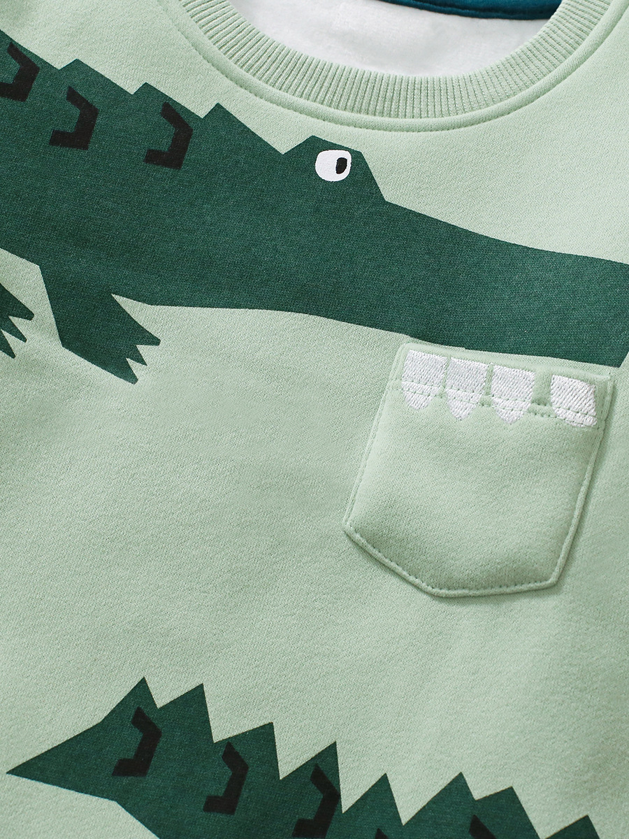-Bluză/sweatshirt din material moale, din bumbac ușor matlasat, de culoare mentă. Model cu croială standard, cu imprimeuri de crocodili și un buzunar frontal cu broderie pentru un stil unic.