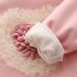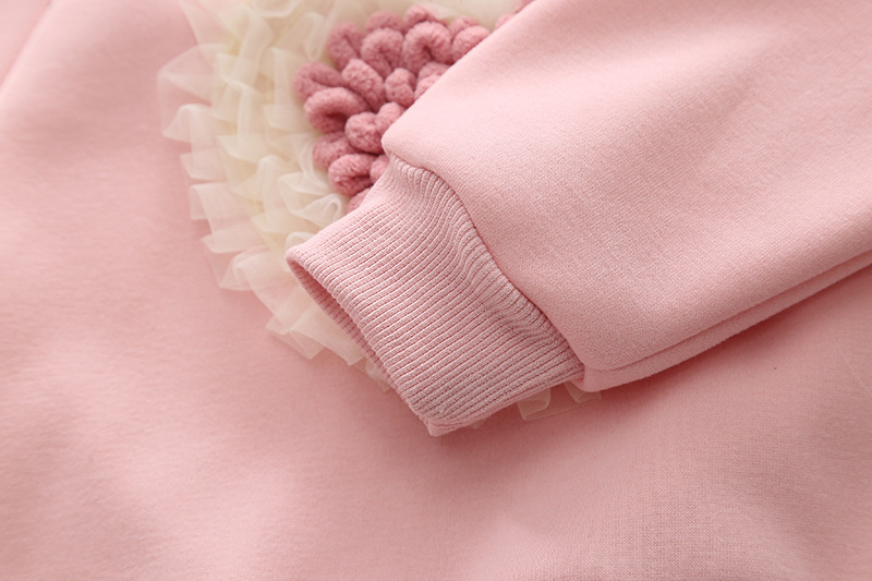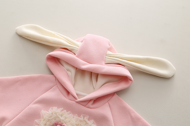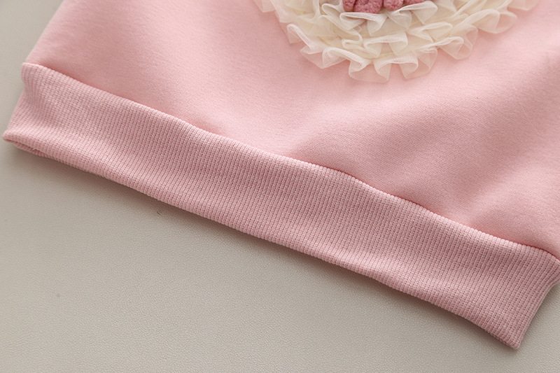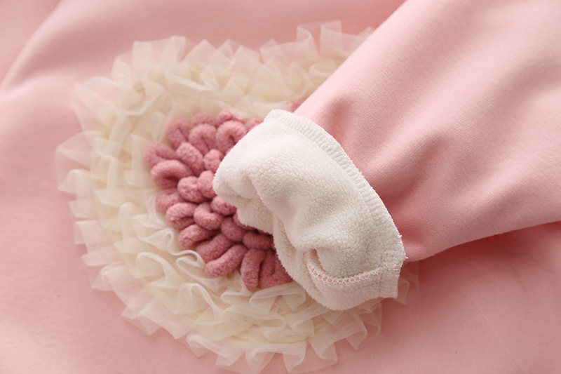 – Hanorac din bumbac, extrem de moale, în nuanță roz-bonbon, cu vată interioară suplimentară. Croială standard + glugă cu urechiușe adorabile. Model cu accent 3D superb – inimă din fire plușate moderne, decorată cu volănașe din tulle delicat.