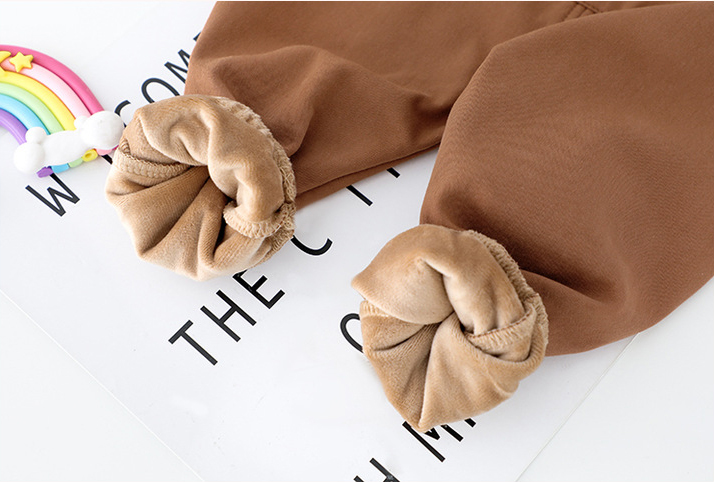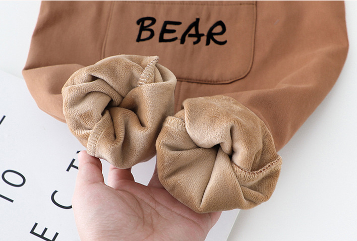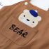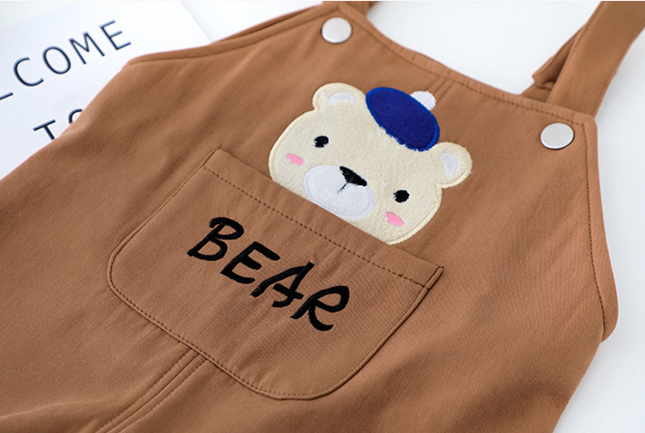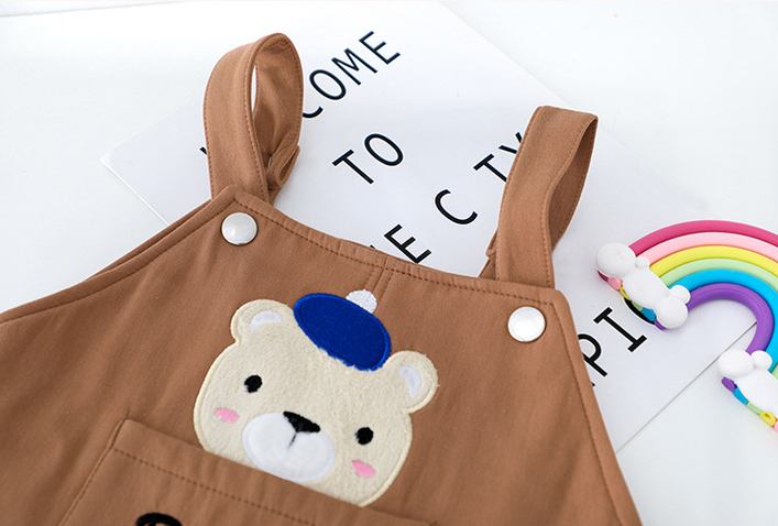 -Salopetă din material căptușit de înaltă calitate, de culoare ciocolatie. Modelul are bretele reglabile pentru o îmbrăcare ușoară și o potrivire perfectă. Este decorată cu un buzunar frontal mare, împodobit cu o aplicație cu ursuleț în față.