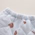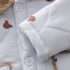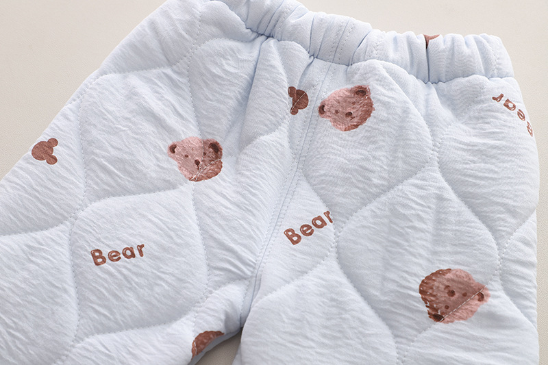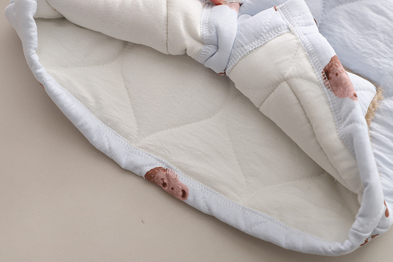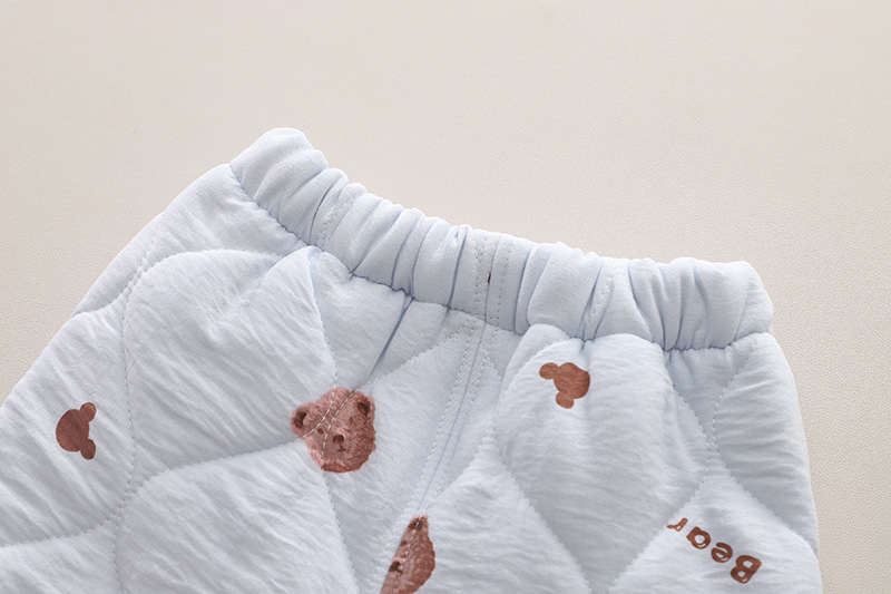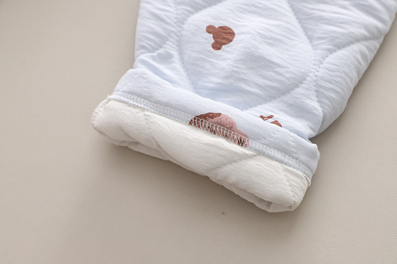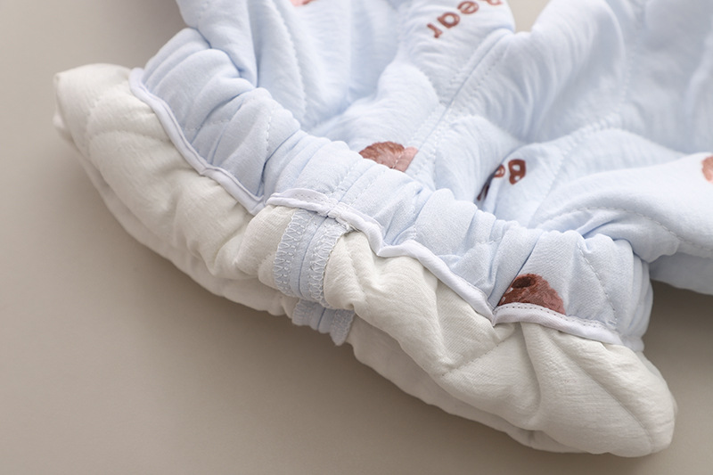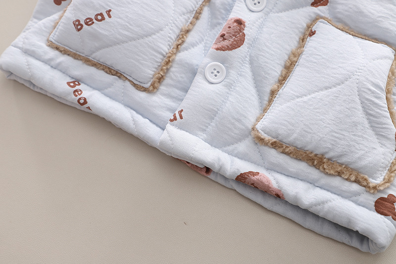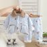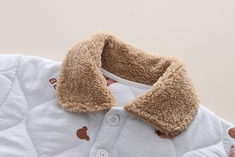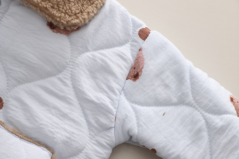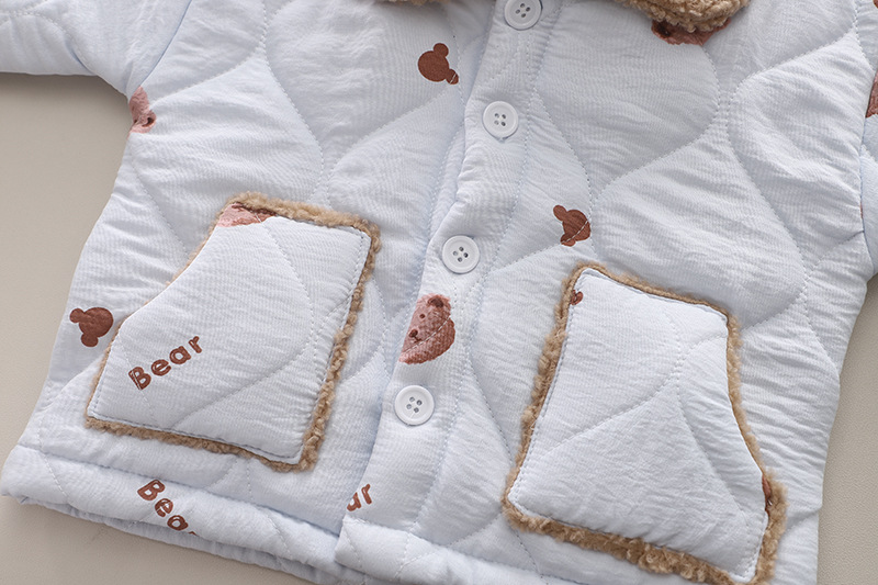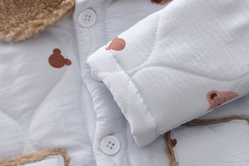 -Jachetă din material moale din bumbac, de culoare albastru deschis, cu umplutură suplimentară din puf ecologic. Modelul include un guler din lână pentru o protecție suplimentară împotriva frigului. Se închide cu nasturi în partea din față și are două buzunare, alături de diverse elemente imprimate pentru un aspect drăguț.