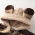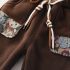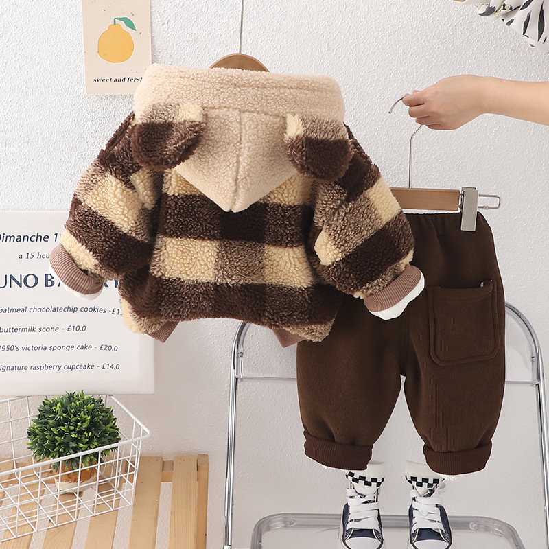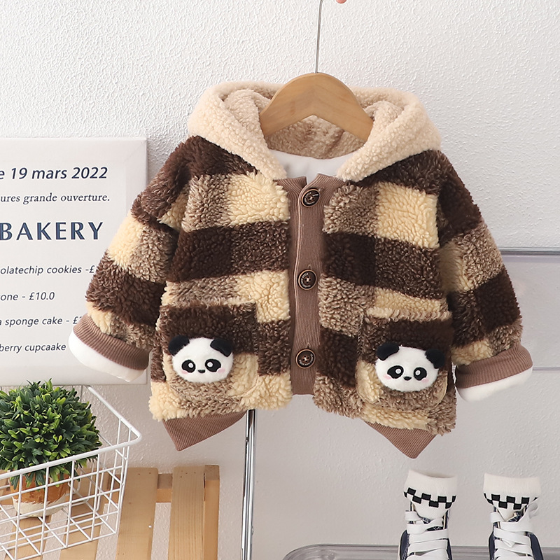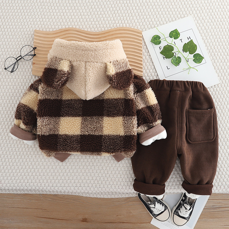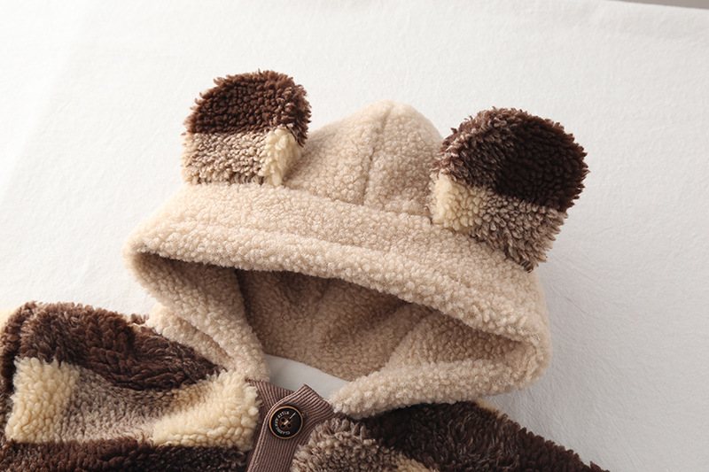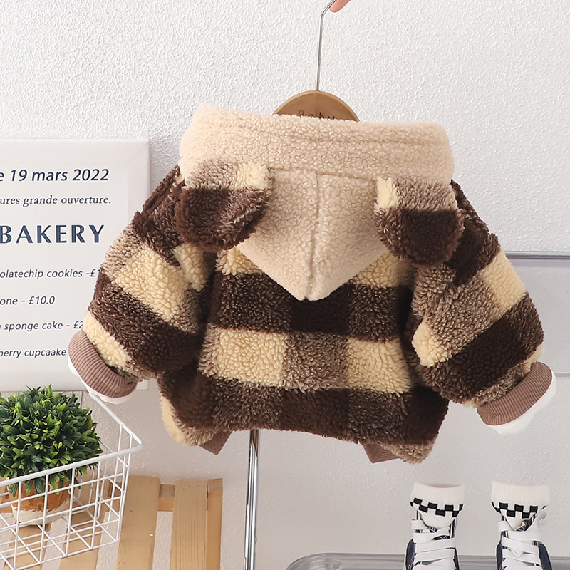 -Geacă din material plușat moale și de înaltă calitate, în combinație de bej și maro, cu model carouri. Modelul este vătuit, prevăzut cu glugă cu urechiușe 3D, închidere cu nasturi și două buzunare decorate cu elemente 3D. Manșetele ripsate de la încheieturi oferă un plus de confort.