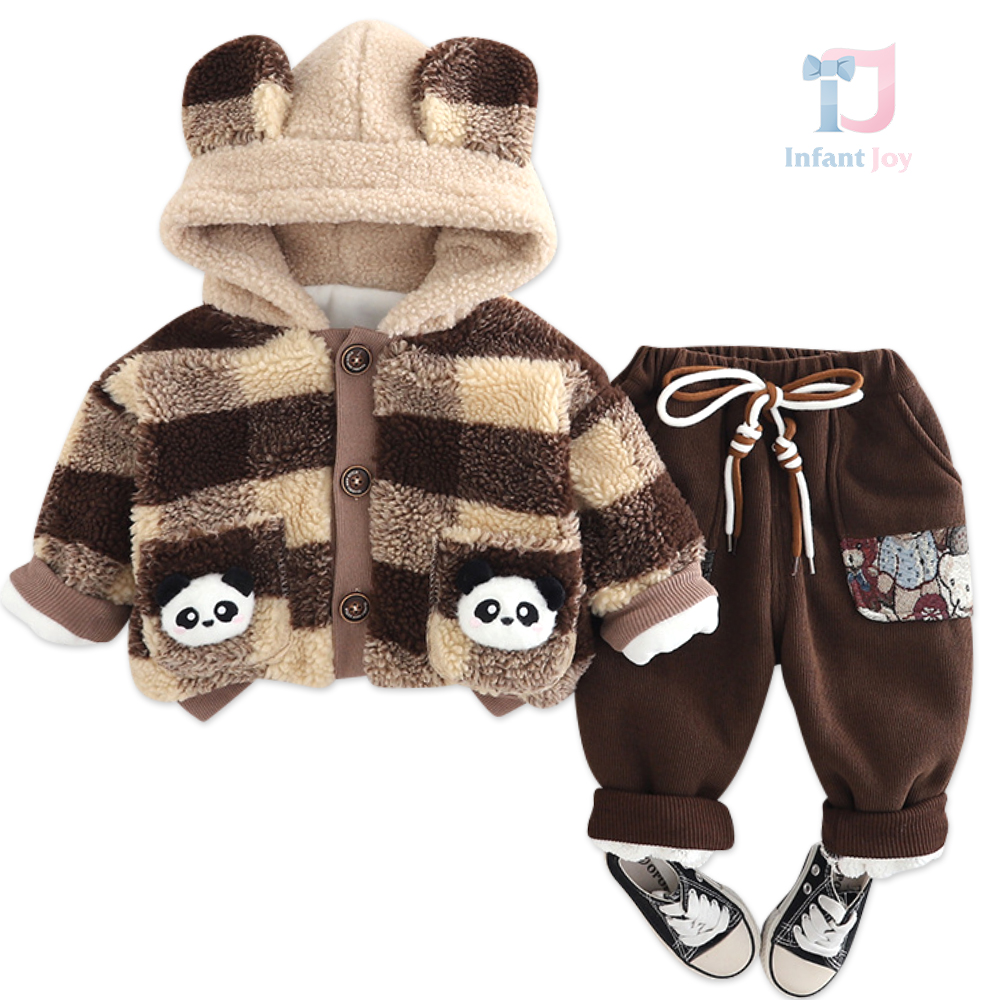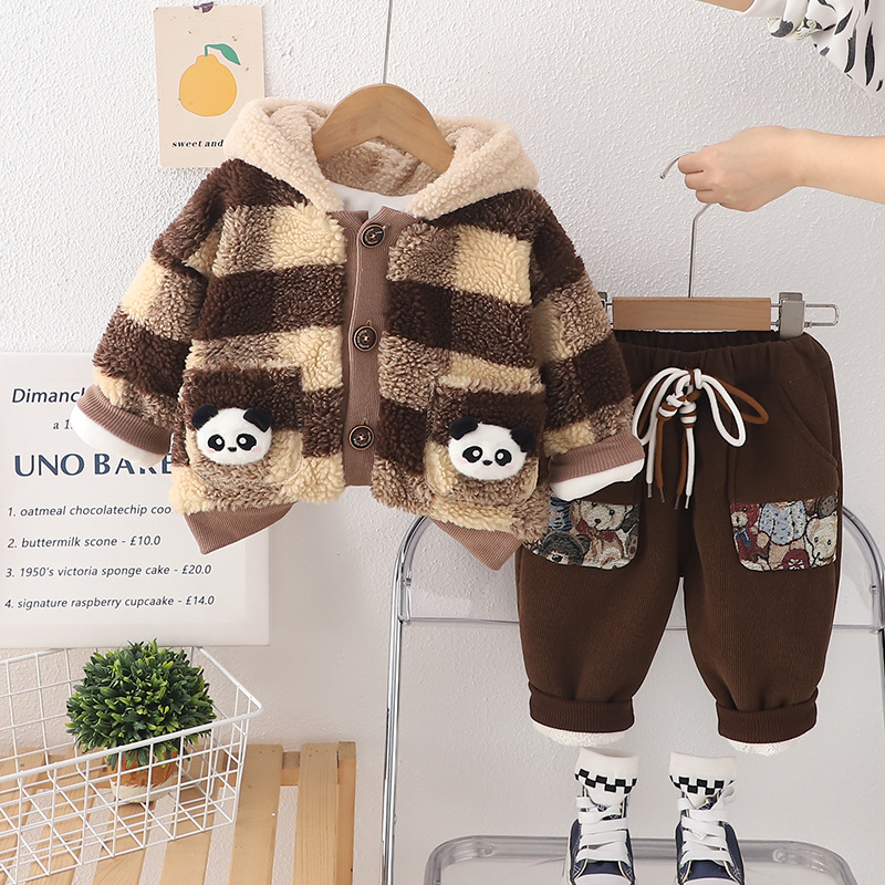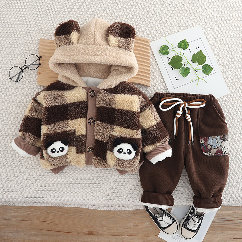 Set matlasat de 2 piese din jachetă plușată cu glugă și pantaloni cu detalii melanjate Adorable Panda