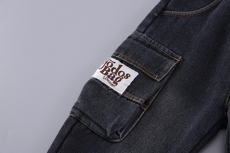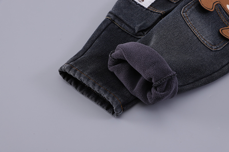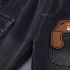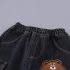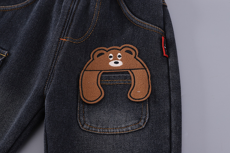 – Pantaloni din denim, într-o nuanță de albastru închis, cu efect de spălare și cu betelie elastică confortabilă. Au buzunar lateral mare tip cargo, cu inscripție și o aplicație drăguță cu ursuleț în partea stângă. Materialul este moale și potrivit pentru joacă activă.
