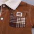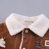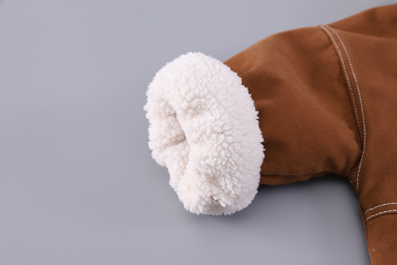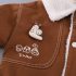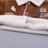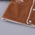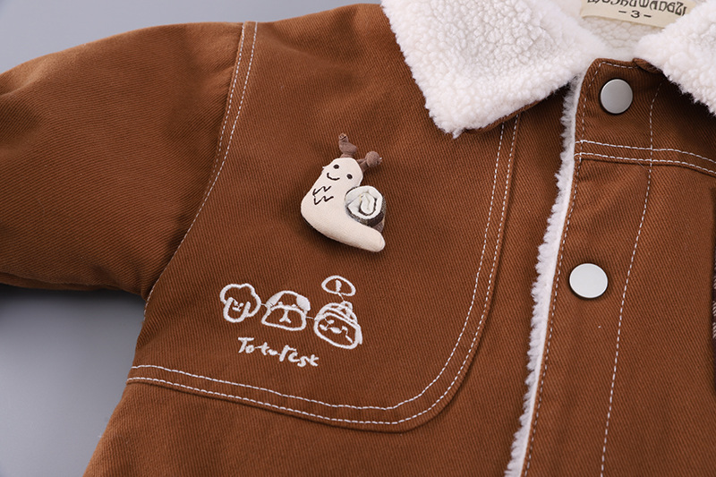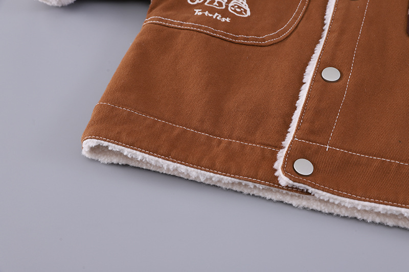 – Geacă matlasată din denim, într-o nuanță caldă de maro, realizată dintr-un material moale și dens. Căptușită pe interior cu vată albă, pufoasă, pentru un plus de căldură. Decorată cu un model în carouri pe buzunar, o broșă mică și detașabilă în formă de melc pe o parte și cusături albe contrastante. Se închide ușor cu capse.