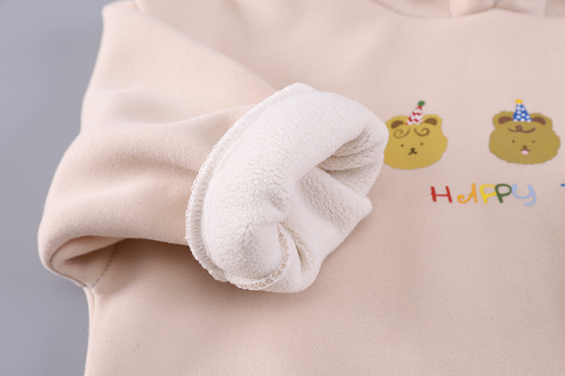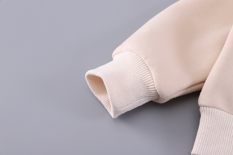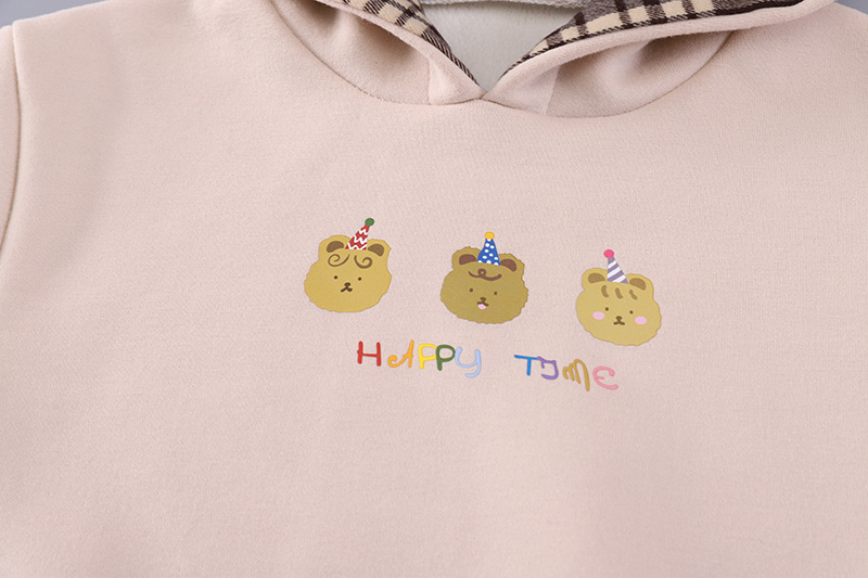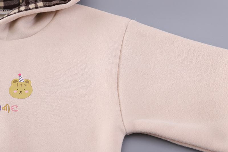 – Bluziță/hanorac cu glugă, într-o nuanță deschisă de bej, cu o imprimare veselă în față. Gluga are căptușeală în carouri, care se asortează stilat cu detaliile gecii. Materialul este moale, călduros și foarte confortabil de purtat.