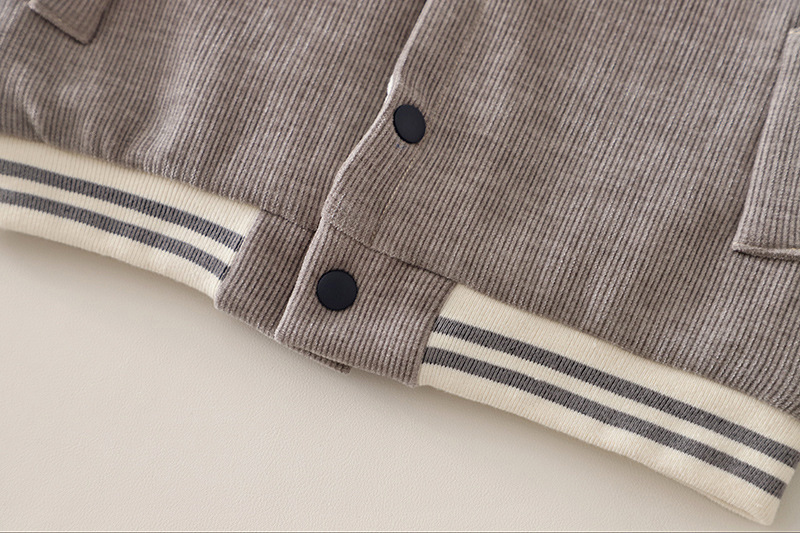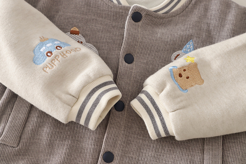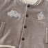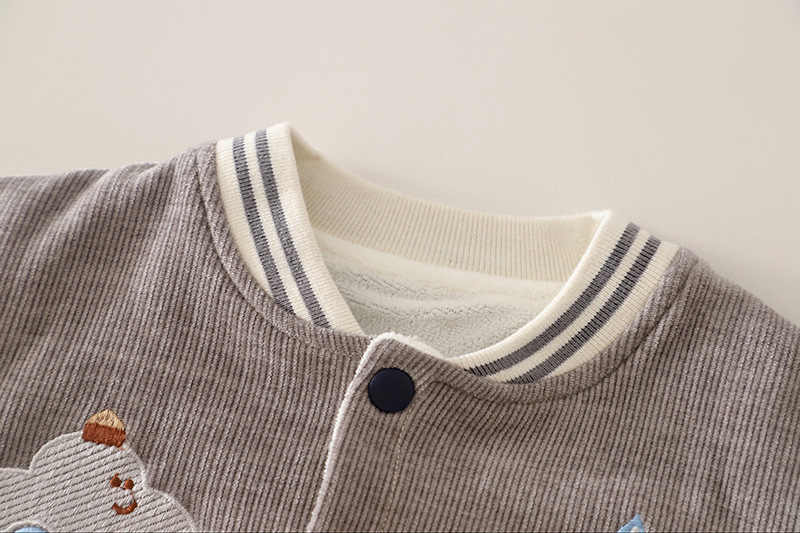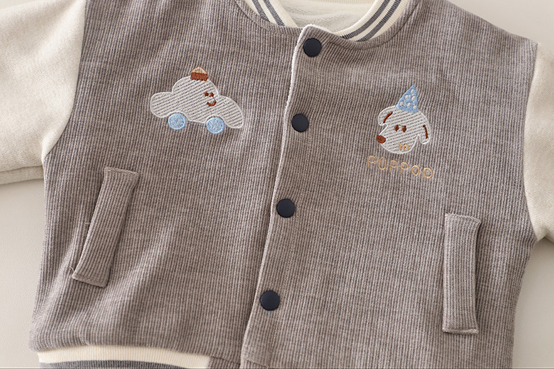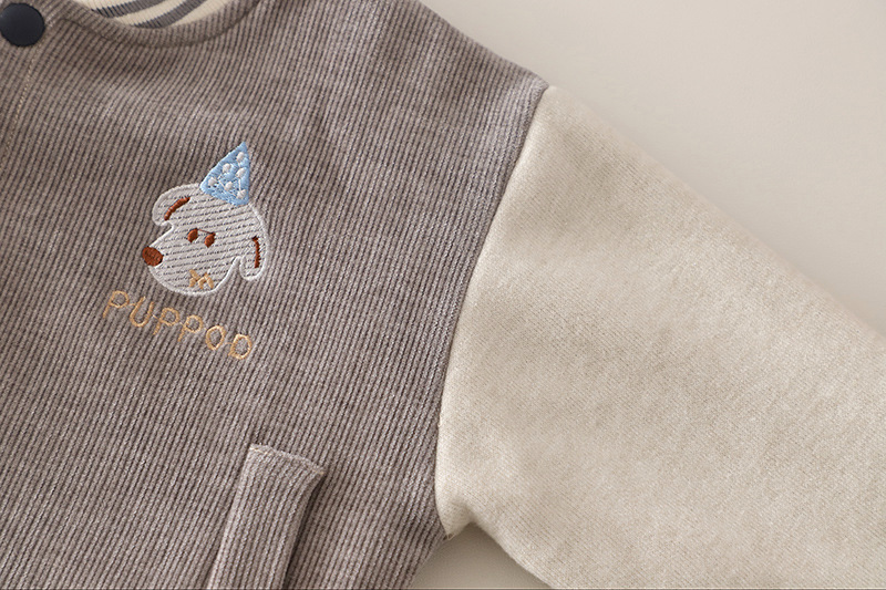 -Geacă tip bomber din material denim moale, în combinație de gri și crem. Este decorată cu broderii fine cu cățeluși și cu nasturi contrastanți în partea din față. Are manșete, guler și tiv inferior din tricot elastic, pentru confort și un aspect sport-elegant.