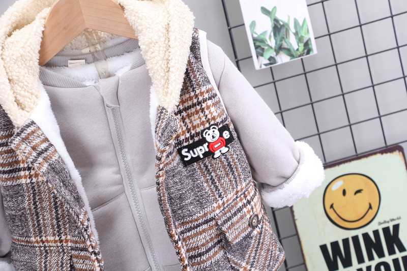 – Vestă cu model în carouri, confecționată dintr-un material gros și moale. Dispune de o glugă plușată care oferă căldură și confort suplimentar. Este decorată cu o aplicație amuzantă cu un mic ursuleț și are buzunare frontale funcționale cu nasturi. Vesta se închide complet în față cu nasturi. Accentul modelului – o broderie mare cu ursuleț în partea din spate.