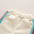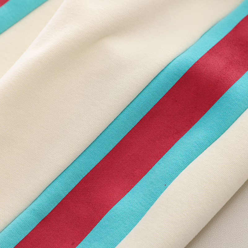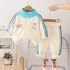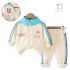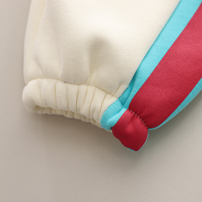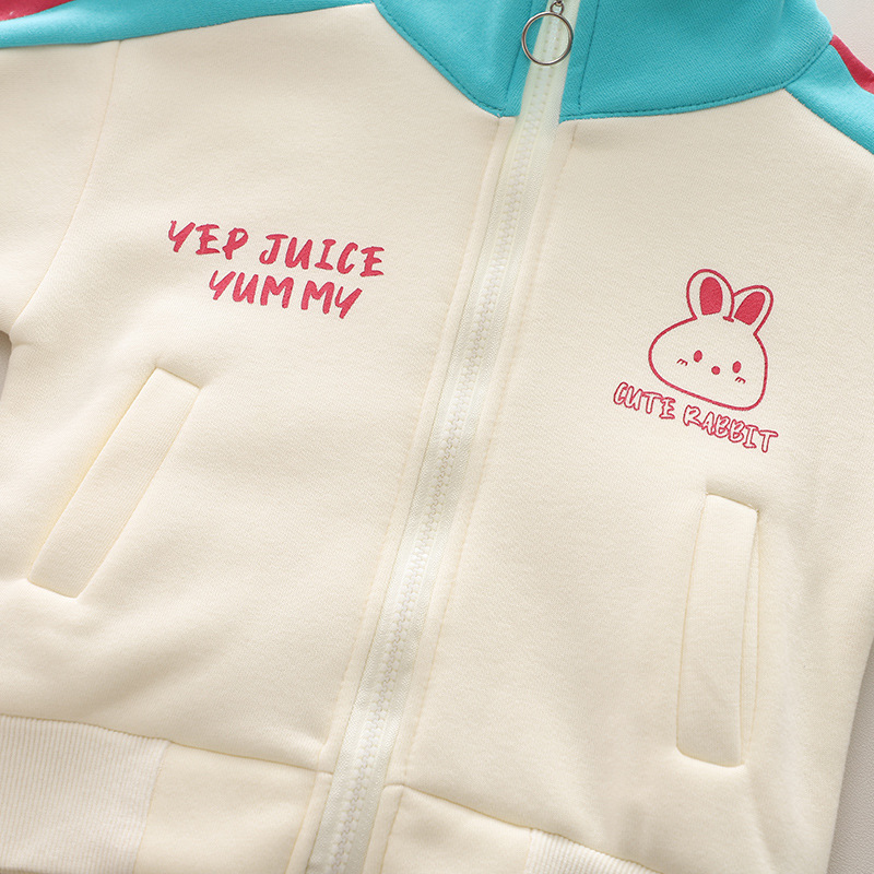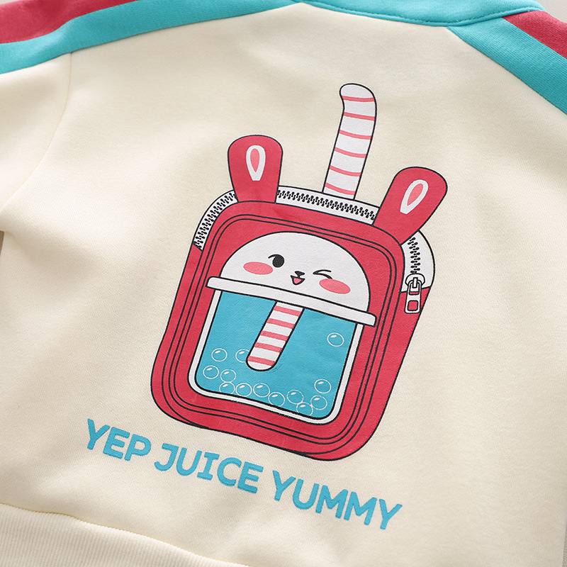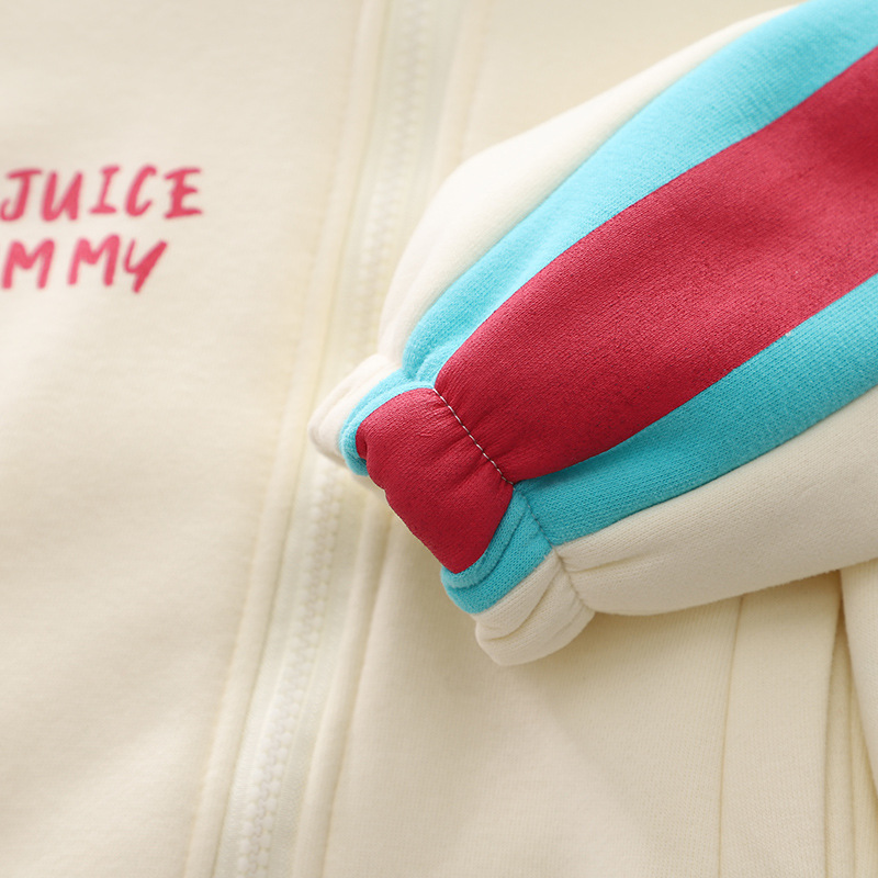 -Hanorac din material de bumbac, căptușit, de culoare vanilie, cu dungi multicolore. Model cu guler înalt și închidere cu fermoar, două buzunare, imprimeuri cu iepuraș și inscripții, precum și manșete elastice.
