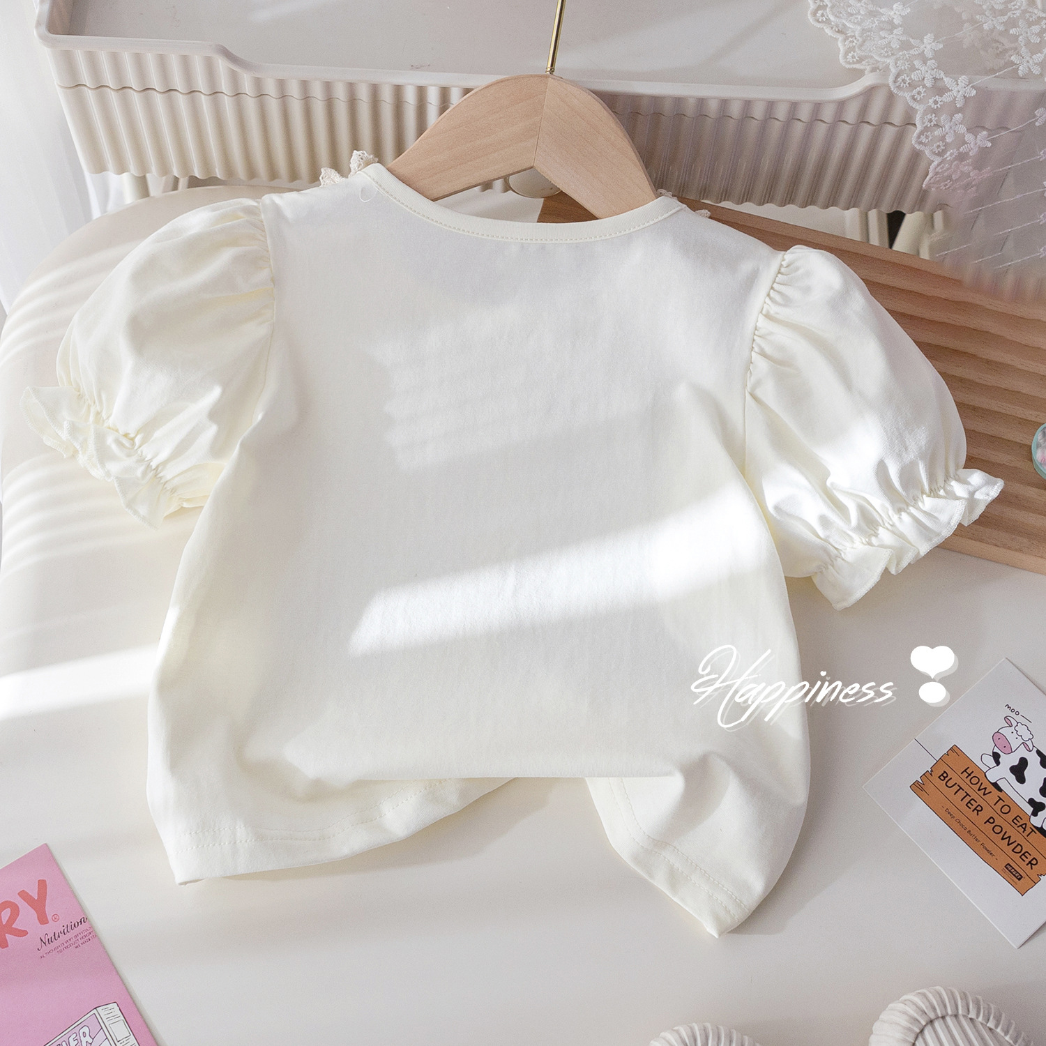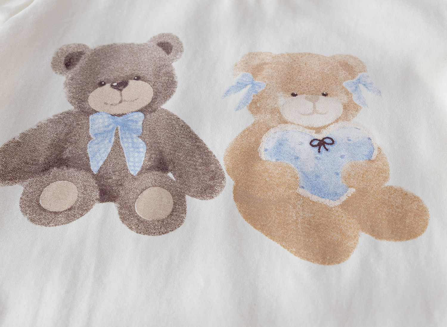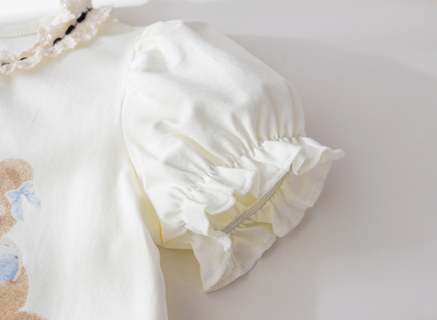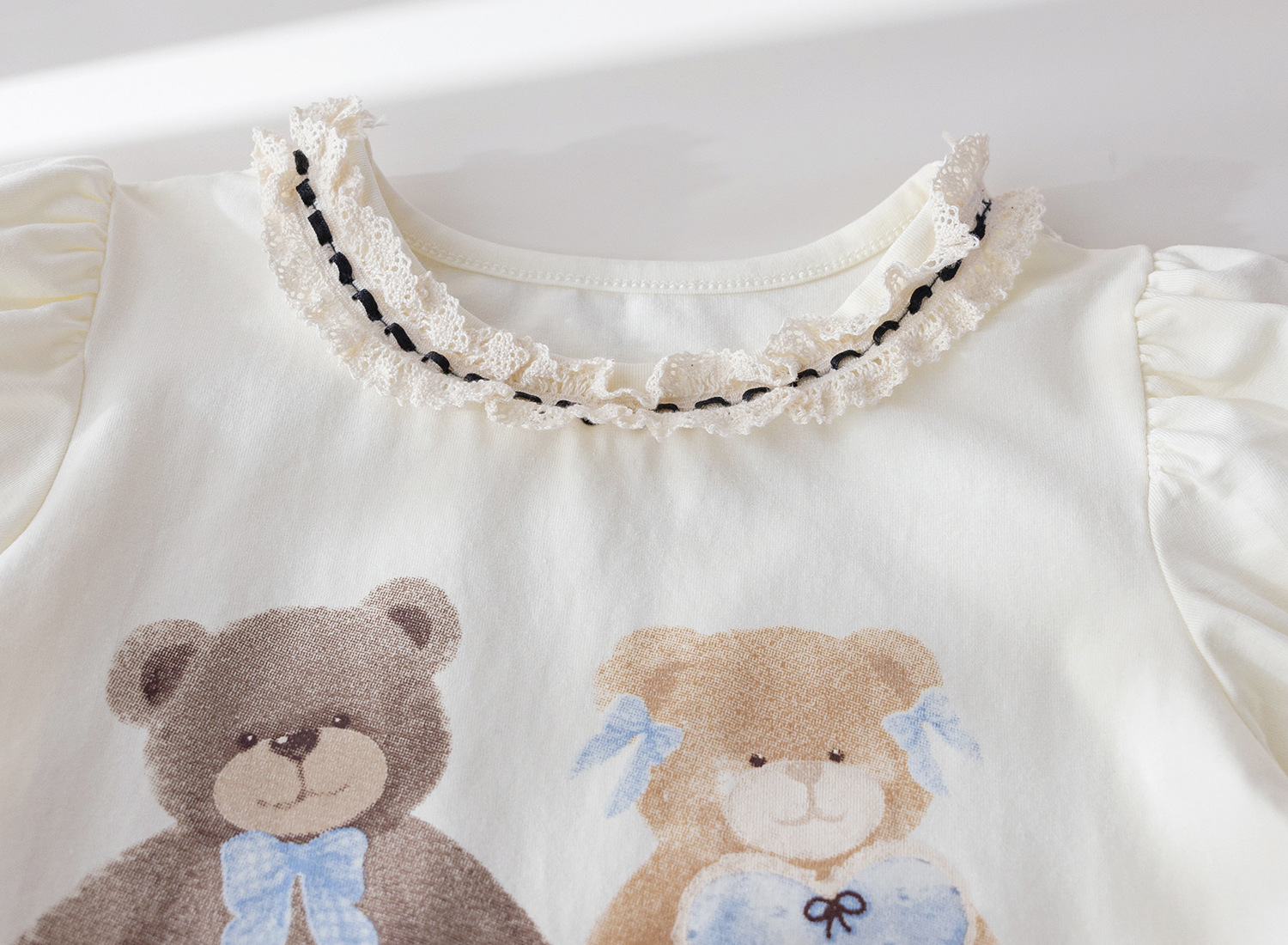 – Bluză cu mânecă scurtă, confecționată dintr-un material moale și plăcut la atingere din bumbac, într-o nuanță crem delicată. Modelul are decolteu rotund, decorat cu o margine fină din dantelă și o linie contrastantă pentru un finisaj elegant. Mânecuțele sunt ușor bufante, cu elastic, ceea ce oferă o siluetă adorabilă. În partea din față se află un imprimeu fermecător cu doi ursuleți de pluș, care creează o notă caldă și copilăroasă.