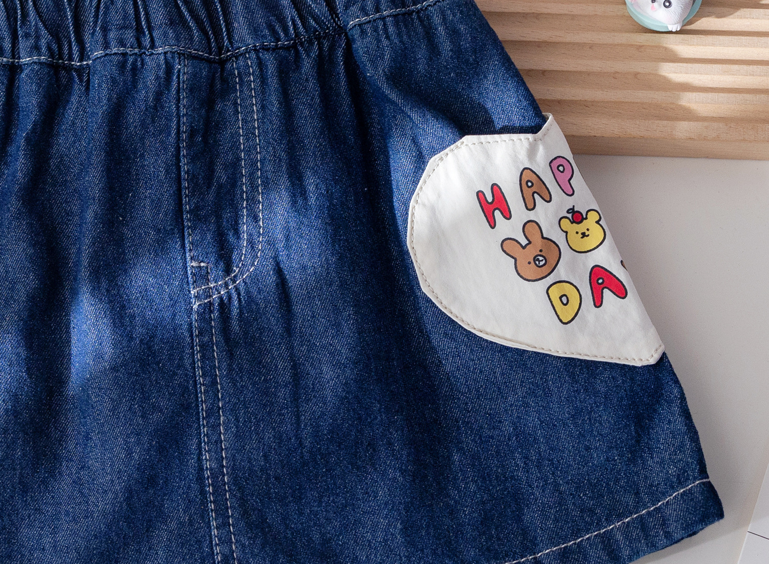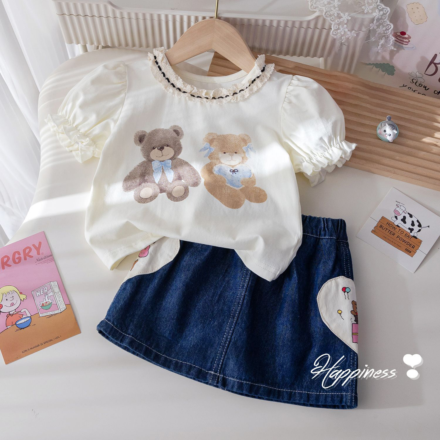 Set modern de 2 piese din bluză cu mânecă bufantă, volane și fustă din denim Sweet Bears