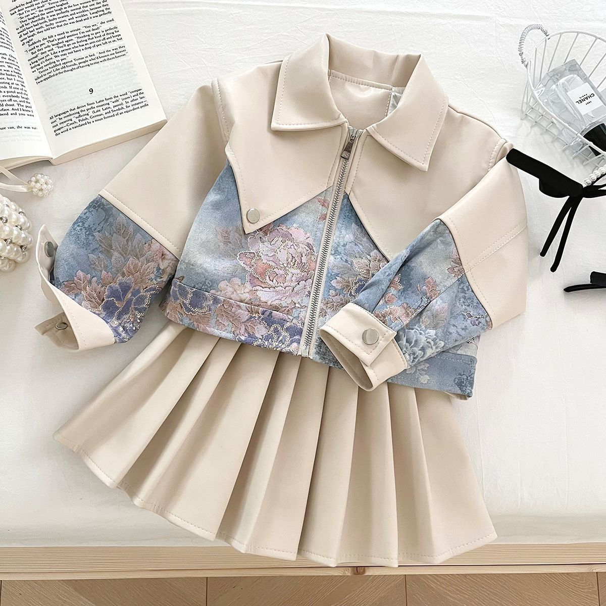 Set modern de 2 piese din jachetă de piele cu motiv floral și fustă plisată Floral Vogue Vanilla
