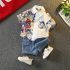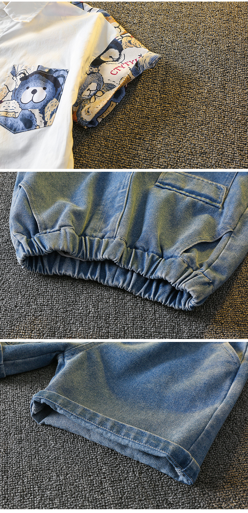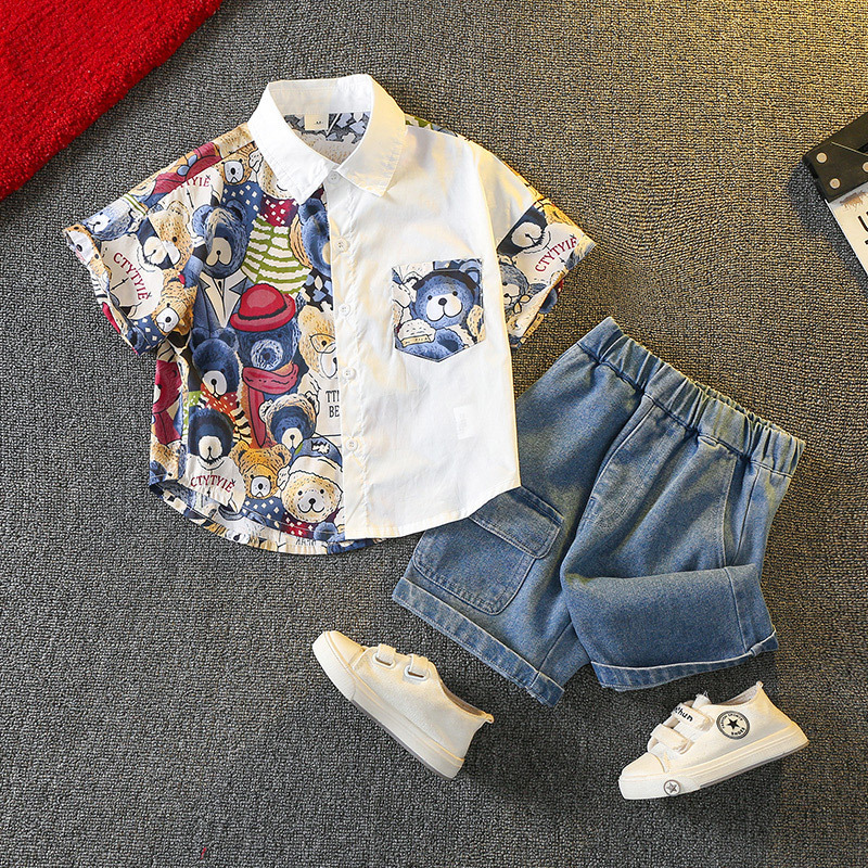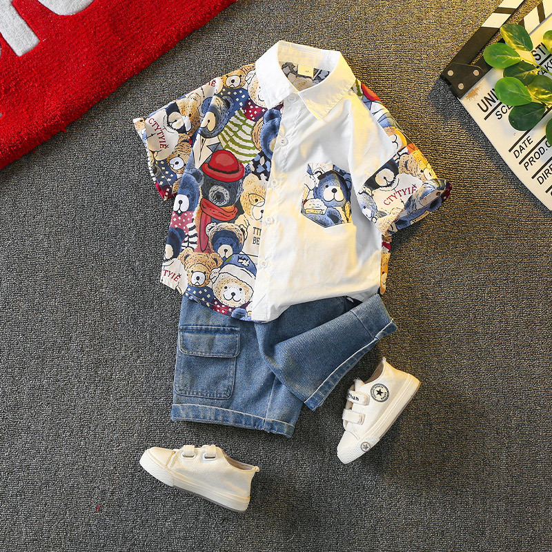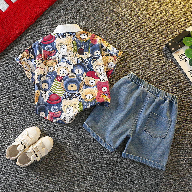 Set modern de 2 piese format din cămașă cu guler clasic, design distinctiv și pantaloni scurți din denim Moderen Bear