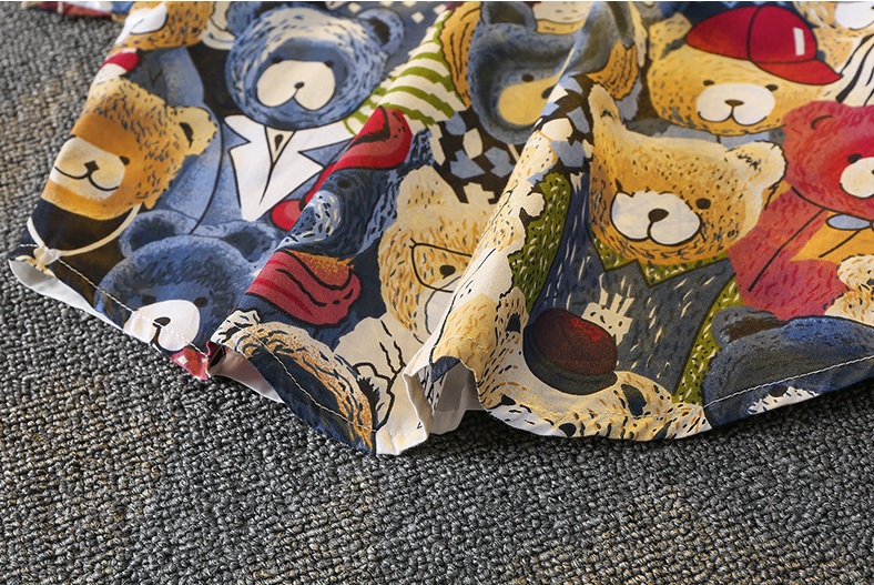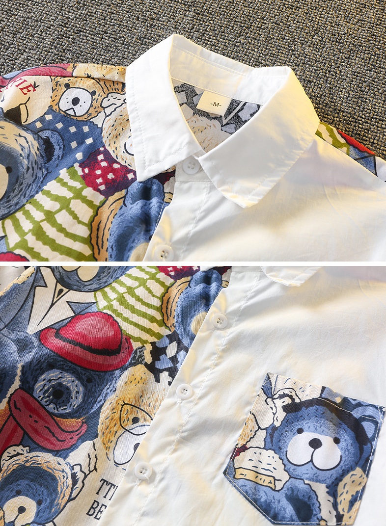 – Cămașă cu mânecă scurtă, confecționată din material ușor și respirabil. Modelul are guler clasic și închidere cu nasturi în față. Designul este deosebit de atractiv – o jumătate este albă, iar cealaltă are un imprimeu colorat cu ursuleți. Buzunarul din față este în același model, iar spatele cămășii este complet cu imprimeul cu ursuleți, creând un aspect armonios și memorabil.