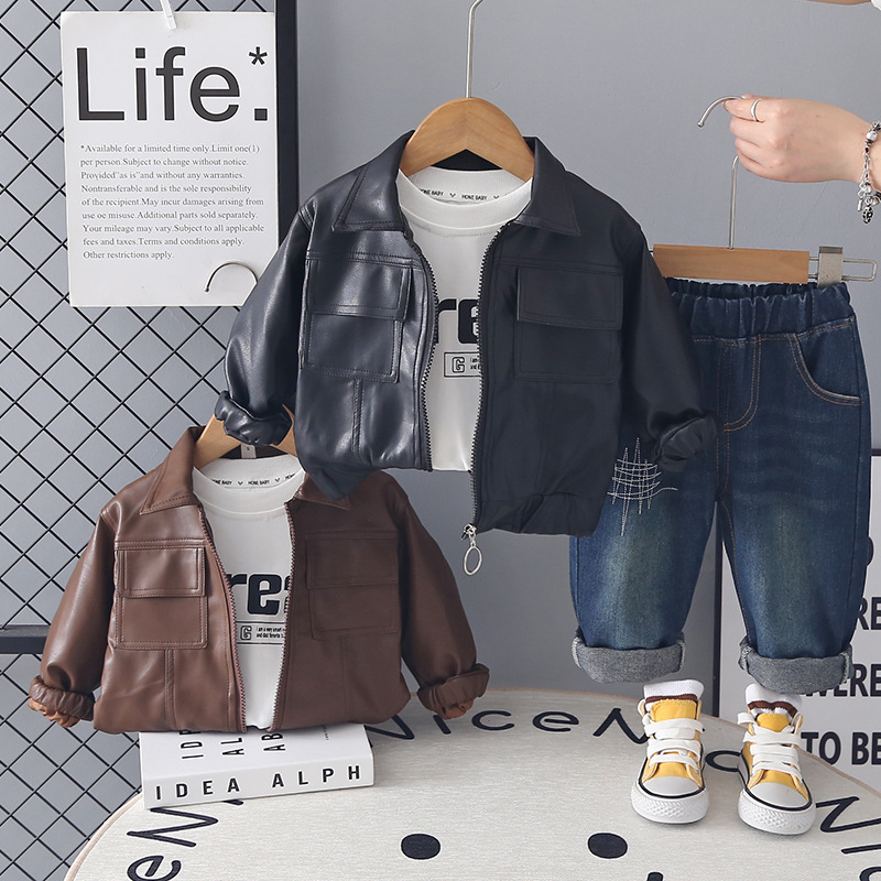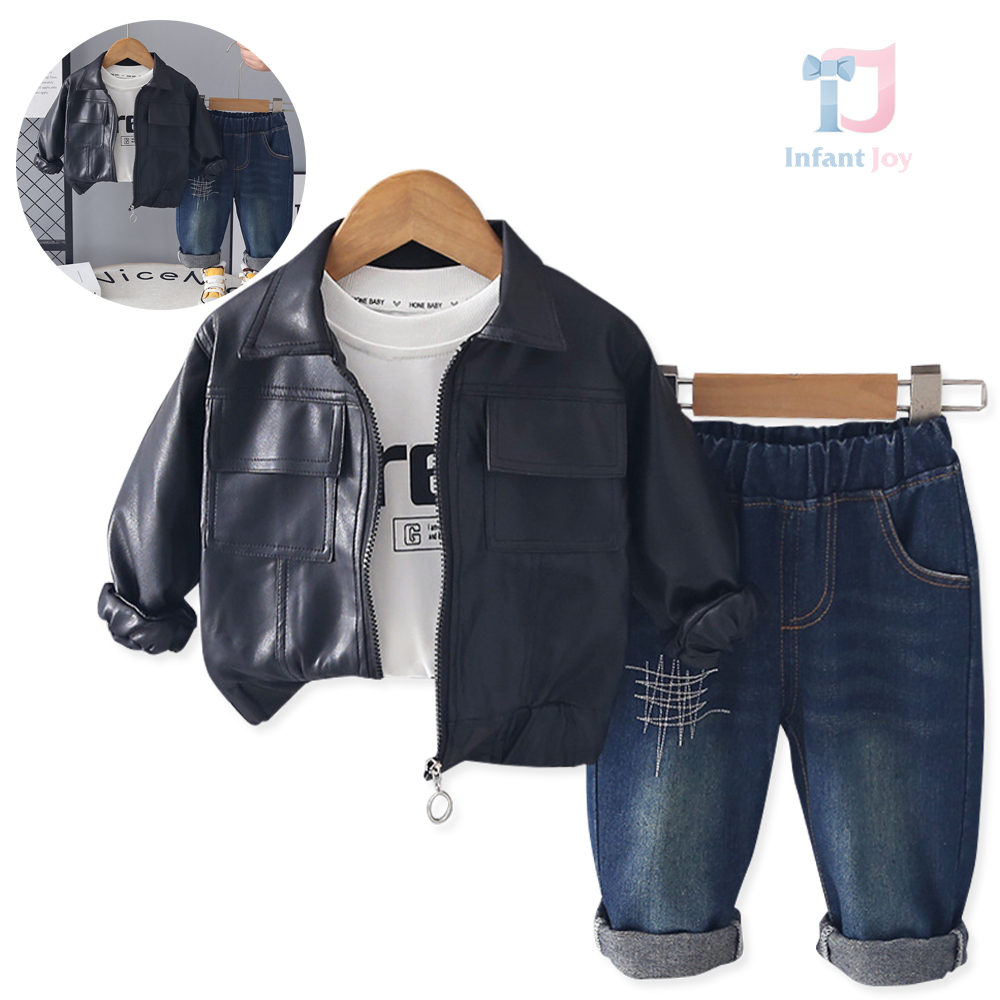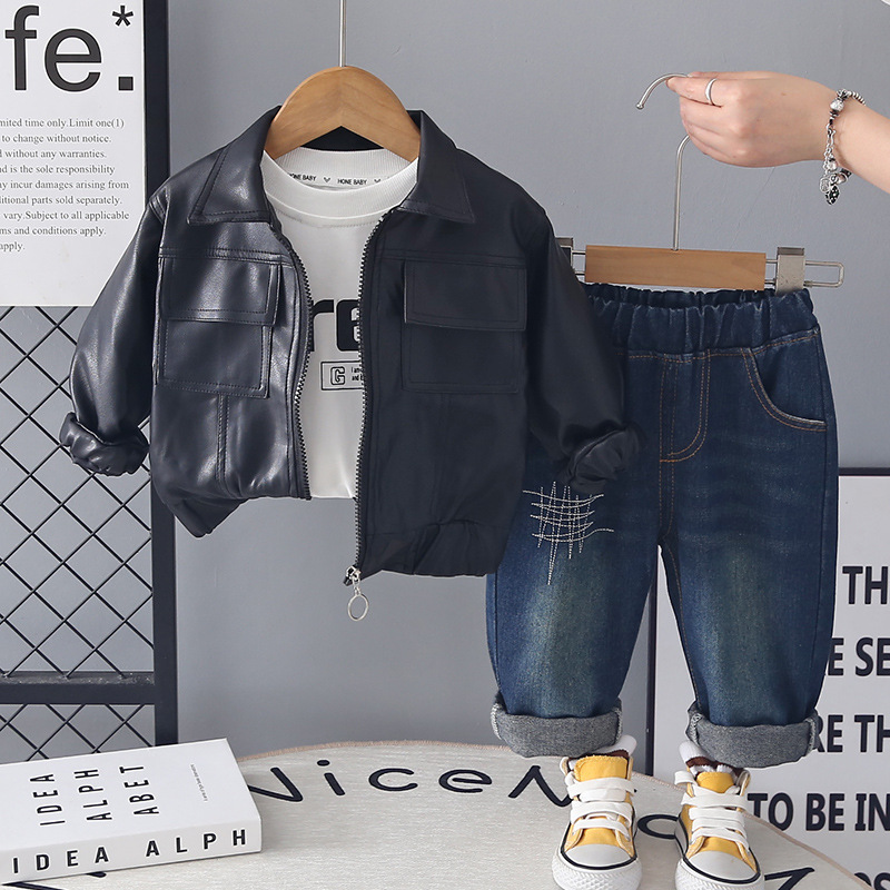 Set modern de 3 piese cu jachetă din piele ecologică, bluză și pantaloni din denim Little Maverick Black