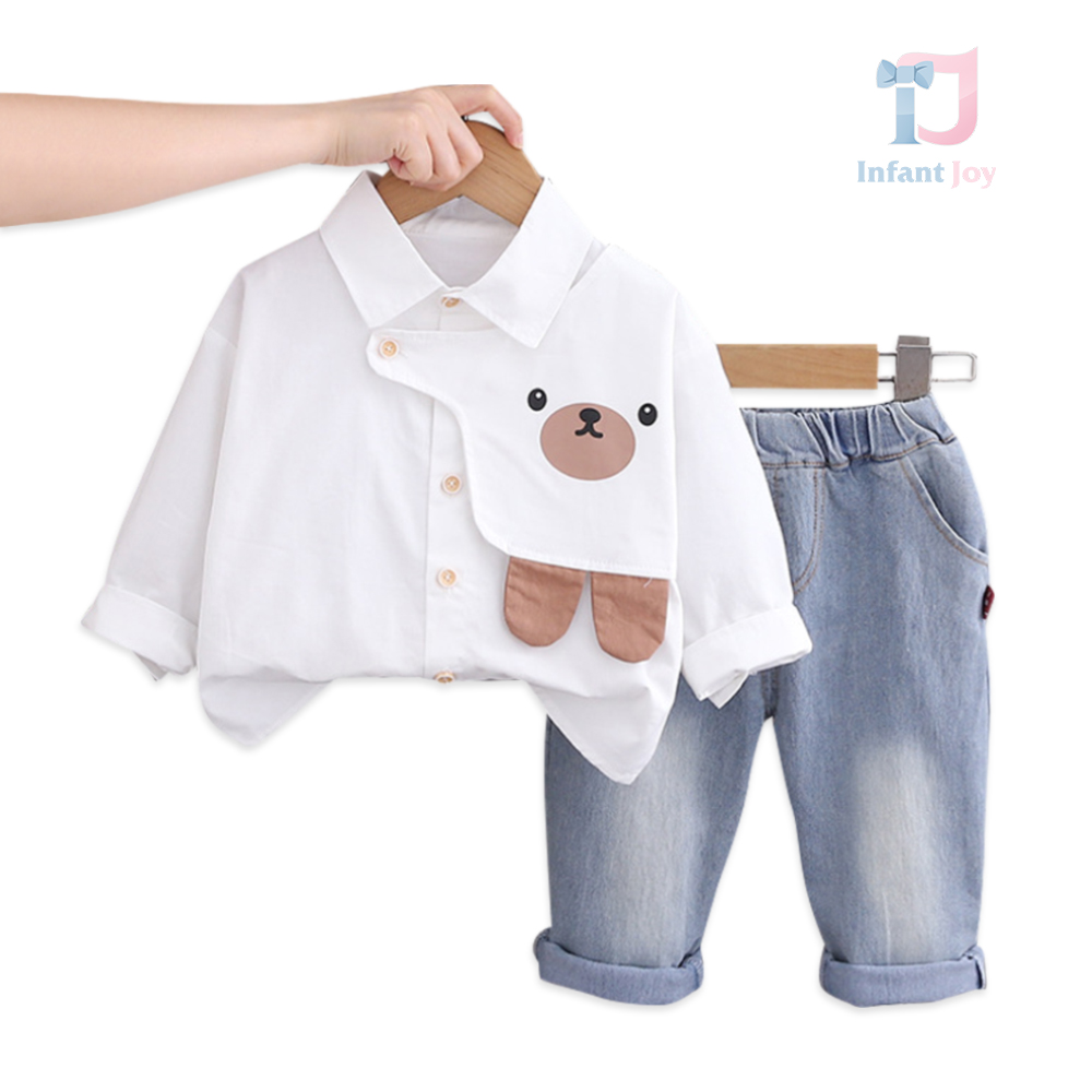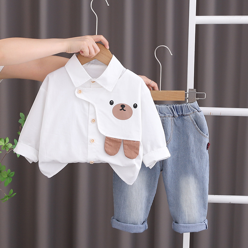 Set modern de 3 piese din cămașă cu guler clasic, aplicație și pantaloni din denim Little Gentlebear