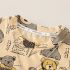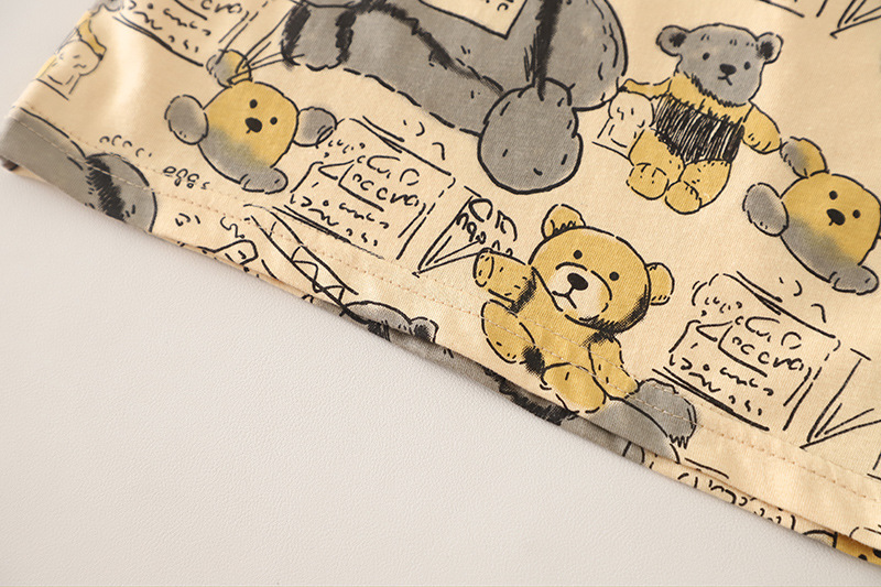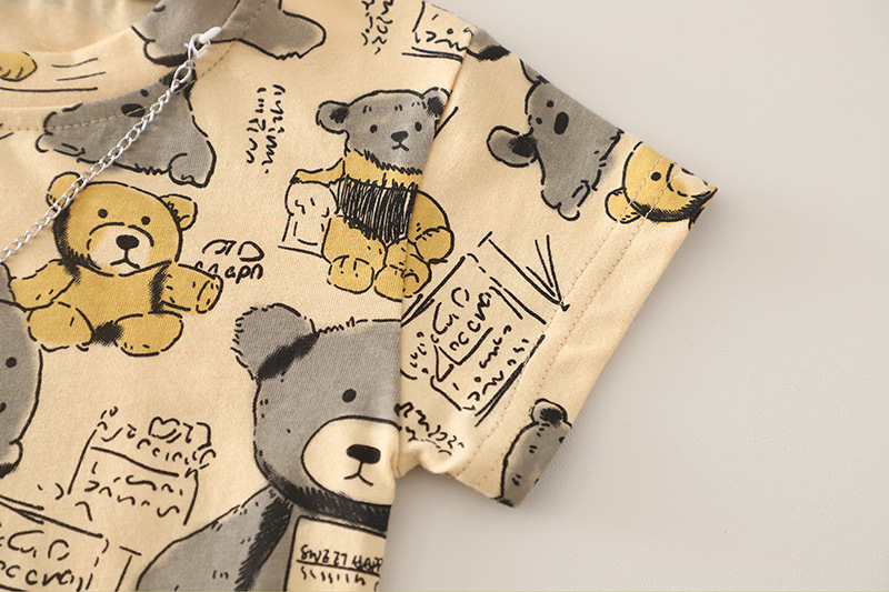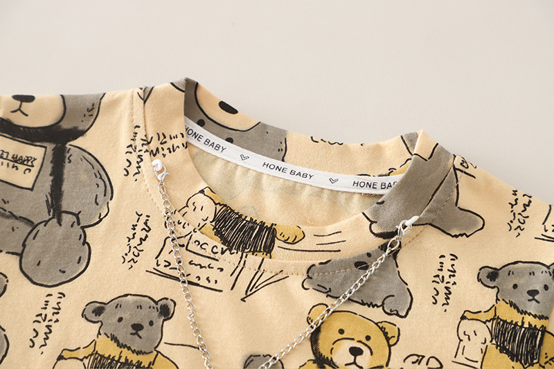 – Tricou cu mânecă scurtă, confecționat din material moale și respirabil din bumbac, într-o nuanță caldă de bej. Modelul are decolteu rotund și croială lejeră. Întreaga suprafață este decorată cu imprimeuri cu ursuleți și elemente text. Accentul îl reprezintă lanțul decorativ din partea superioară, care adaugă un stil modern și ușor rebel.